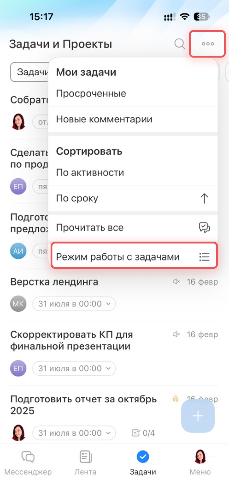 В мобильном приложении есть три режима просмотра задач. Каждый помогает по-разному организовать работу — быстро просматривать задачи, следить за сроками или планировать этапы работы. Чтобы изменить режим, в разделе Задачи нажмите Три точки (...) > Режим работы с задачами.