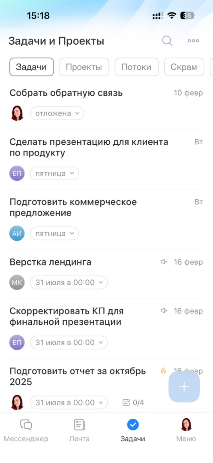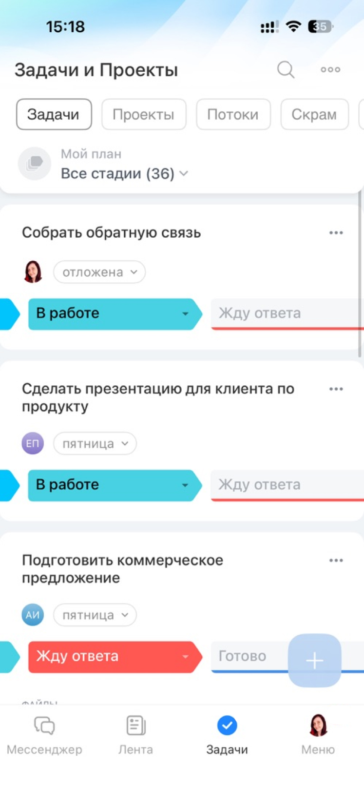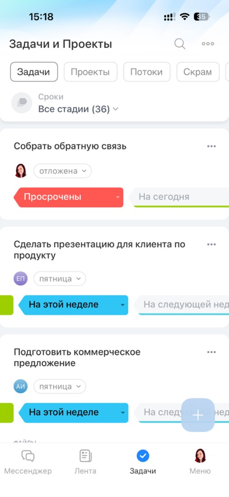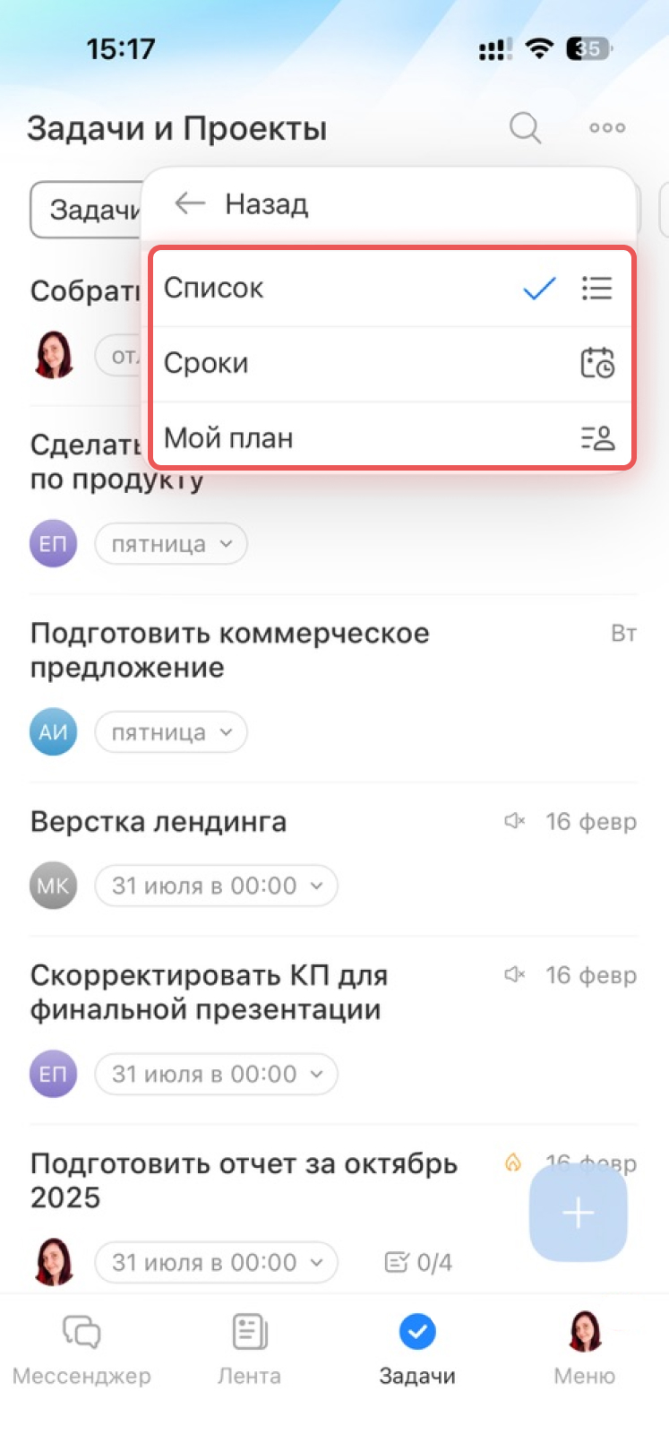 - В мобильных задачах есть три режима просмотра: Список — для быстрого просмотра задач, Сроки — для контроля дедлайнов, Мой план — для распределения задач по стадиям.