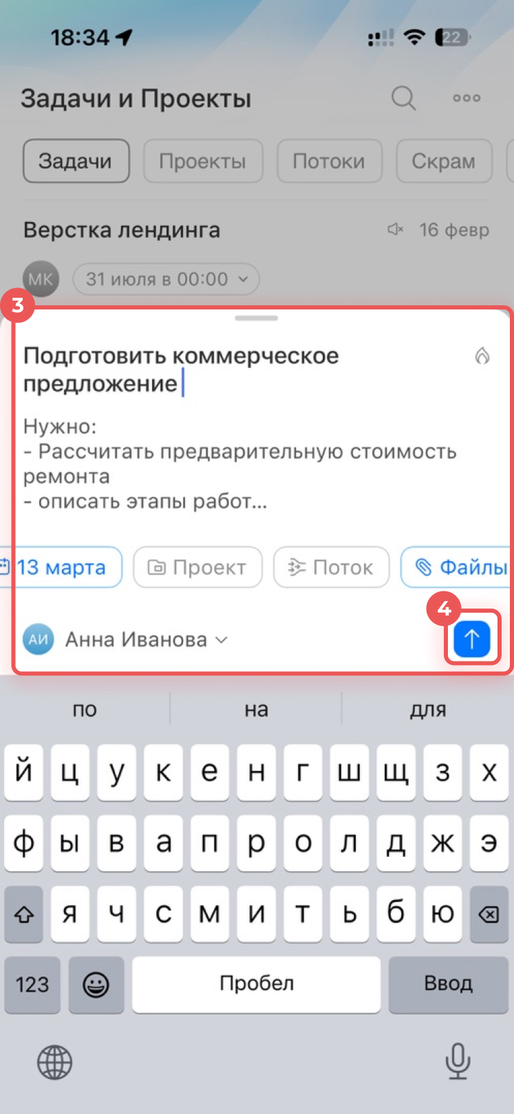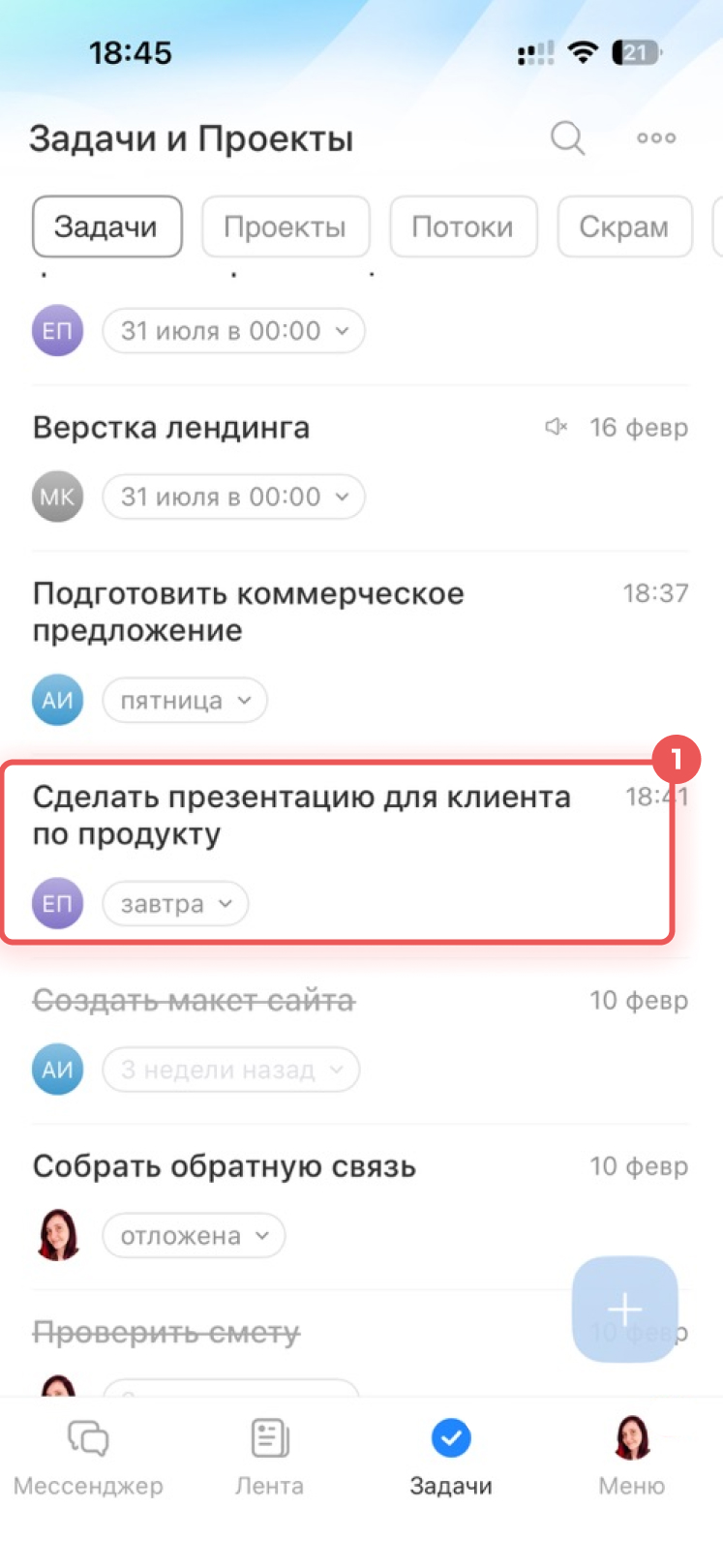 Создавайте задачу сразу, как только появляется договоренность — прямо с телефона. Например, после встречи с клиентом, на объекте, в такси по дороге в офис. Так вы не потеряете детали и сразу передадите поручение сотруднику.