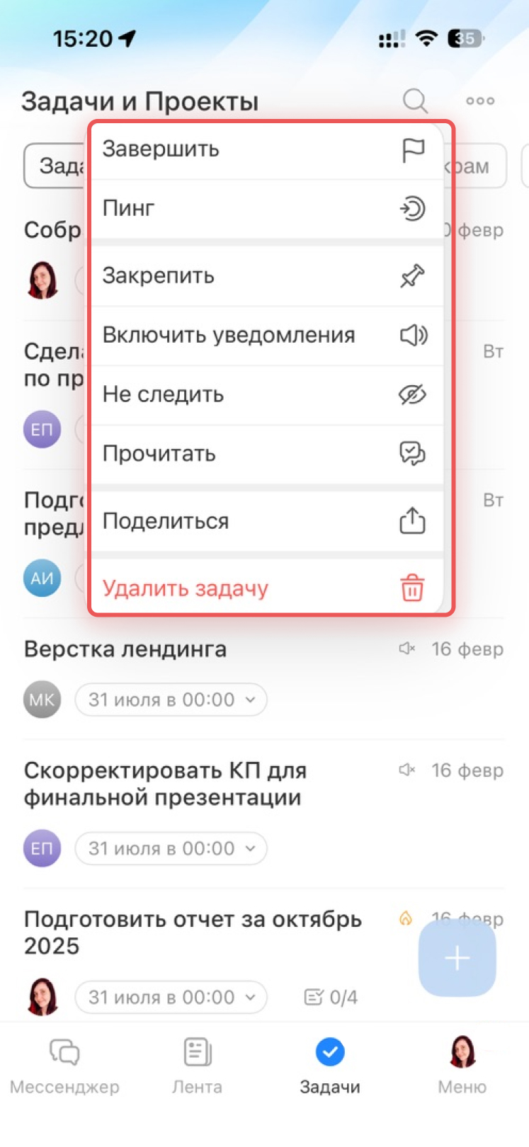 - Зажмите задачу в любом режиме просмотра — откроется меню быстрых действий, например, завершить задачу или отправить пинг.