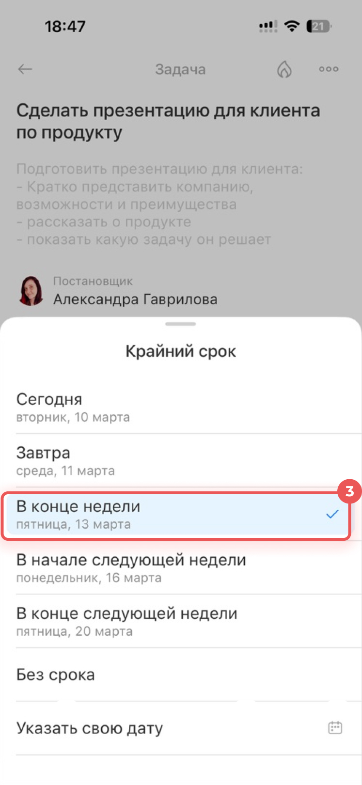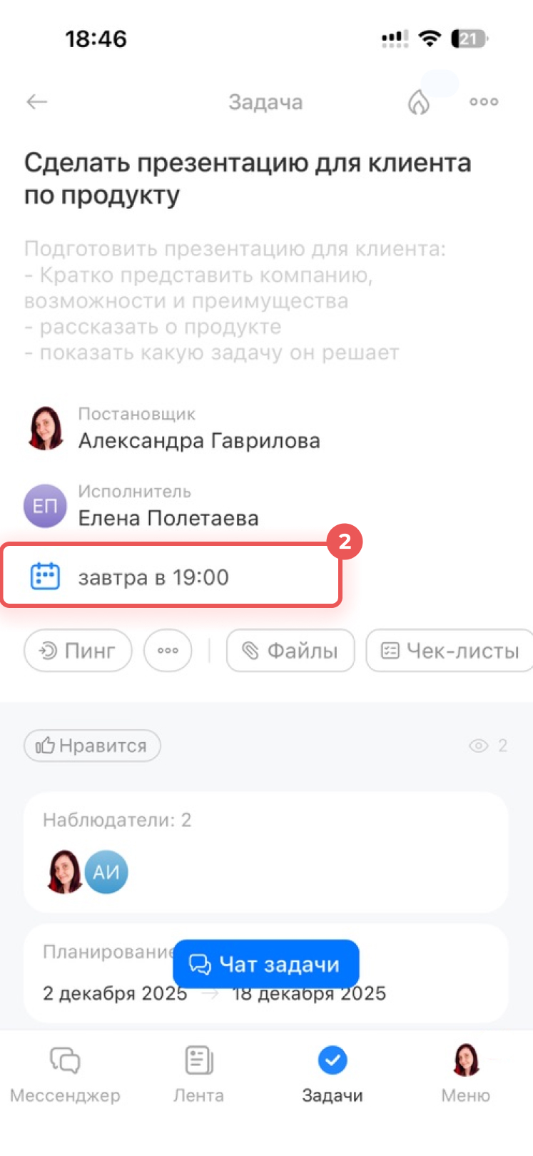 Рабочие условия меняются: сдвигаются сроки, появляются новые вводные, добавляются файлы. Важно обновлять задачу сразу, чтобы в ней оставалась актуальная информация. Например, вы поставили задачу подготовить презентацию к среде. Позже клиент перенес встречу на пятницу и прислал новые материалы. Достаточно открыть задачу в мобильном приложении, изменить крайний срок и добавить файл — исполнитель сразу увидит обновления.