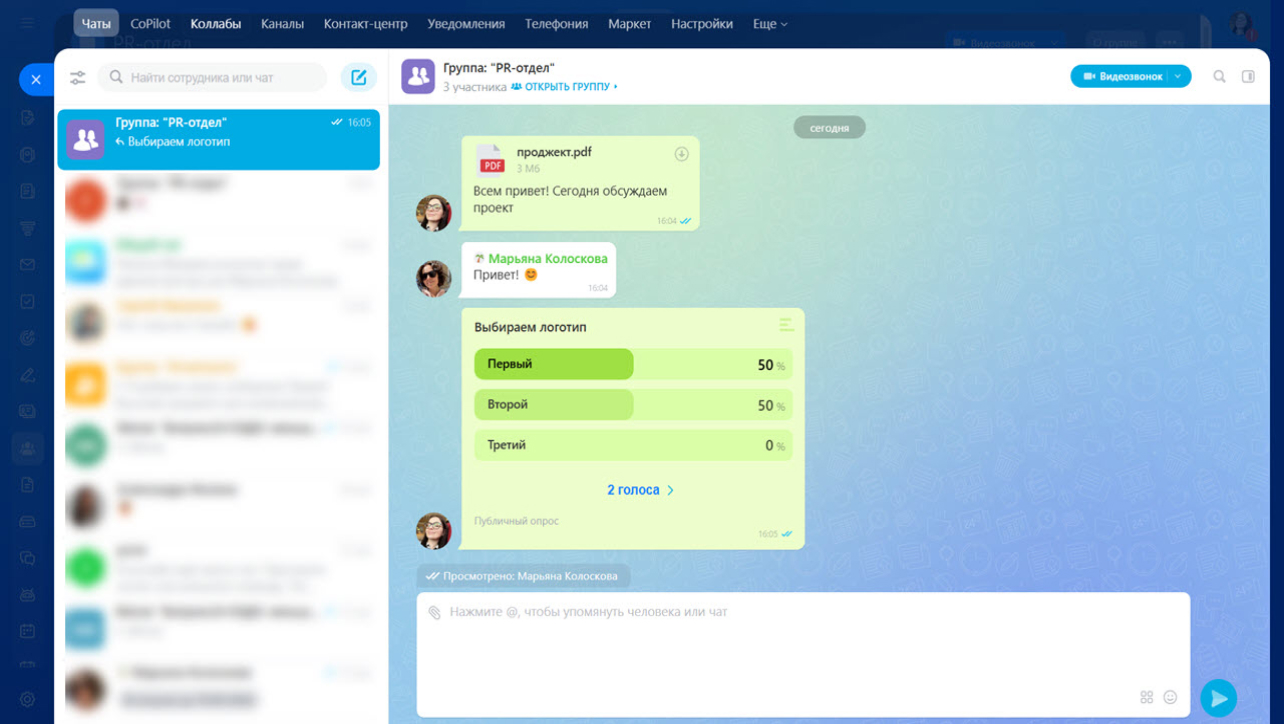 Чат в группе или проекте — это общий чат для всех участников, который создается автоматически. Не нужно вручную создавать чат и добавлять сотрудников: они подключатся сами, а вся переписка по проекту будет храниться в одном месте. Если к группе или проекту присоединится новый сотрудник, он сразу попадет в чат и сможет увидеть текущее обсуждение.