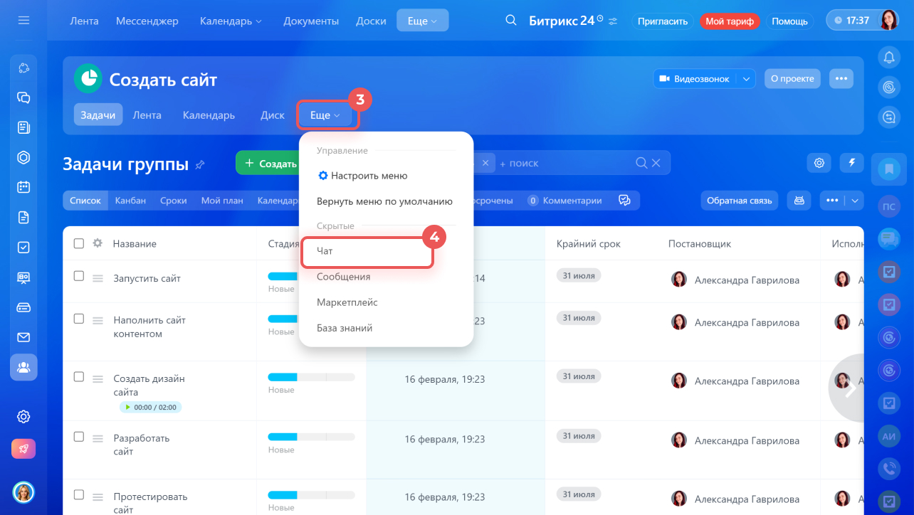 3–4. Нажмите Еще > Чат. Откроется чат группы или проекта.
