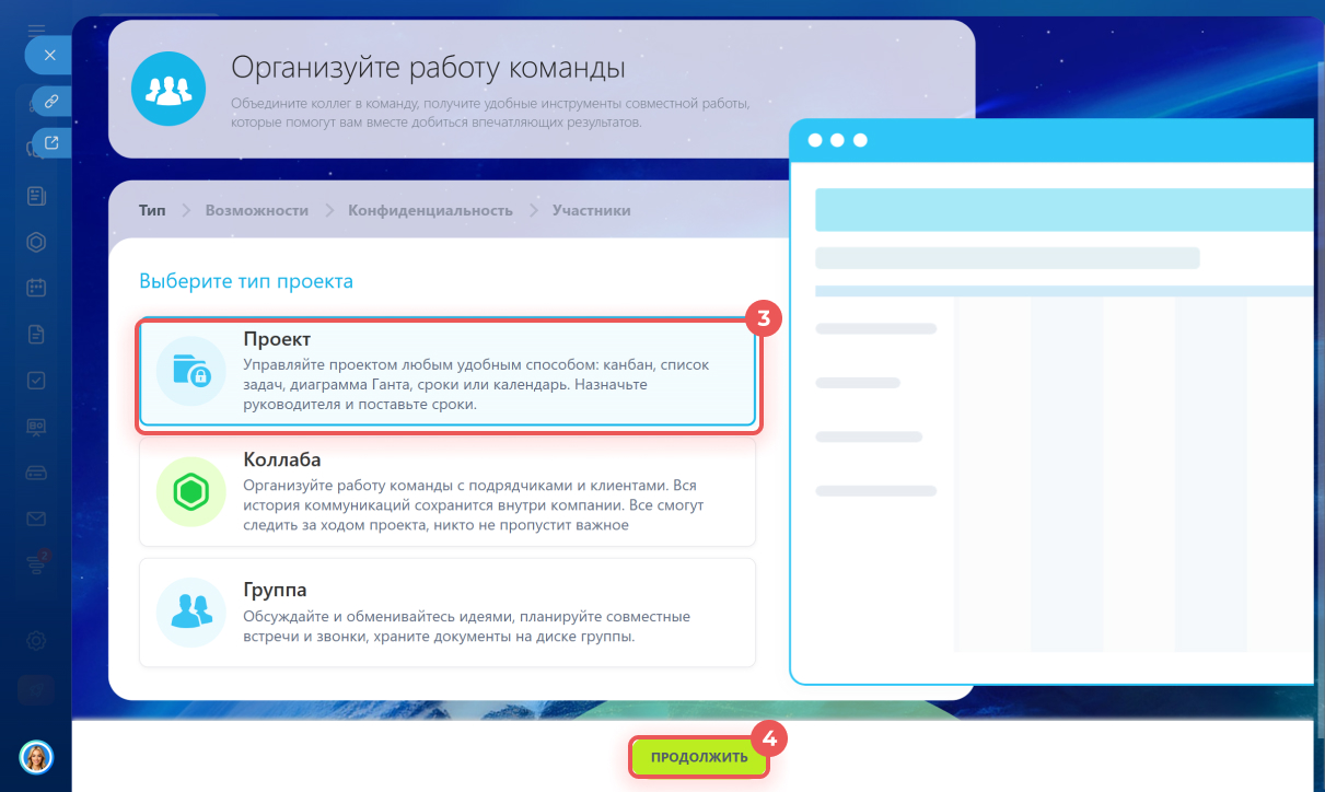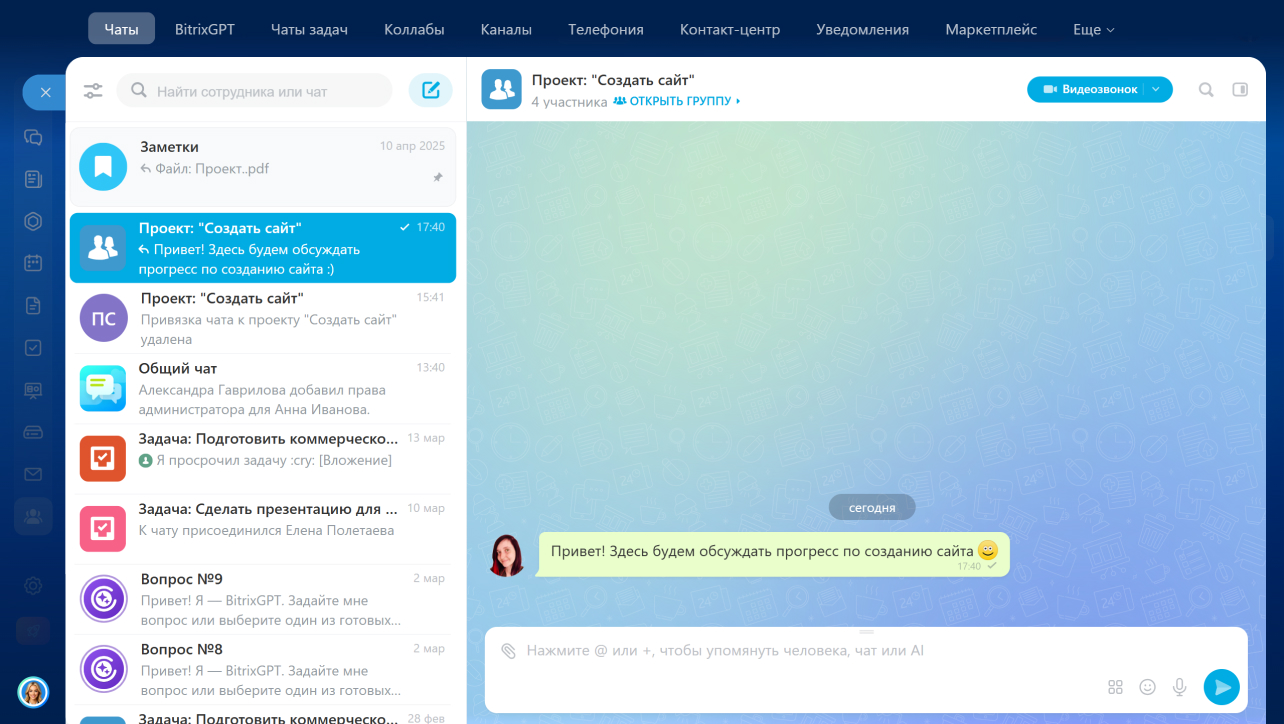 - Чат в группе или проекте — это общий чат для всех участников, который создается автоматически.