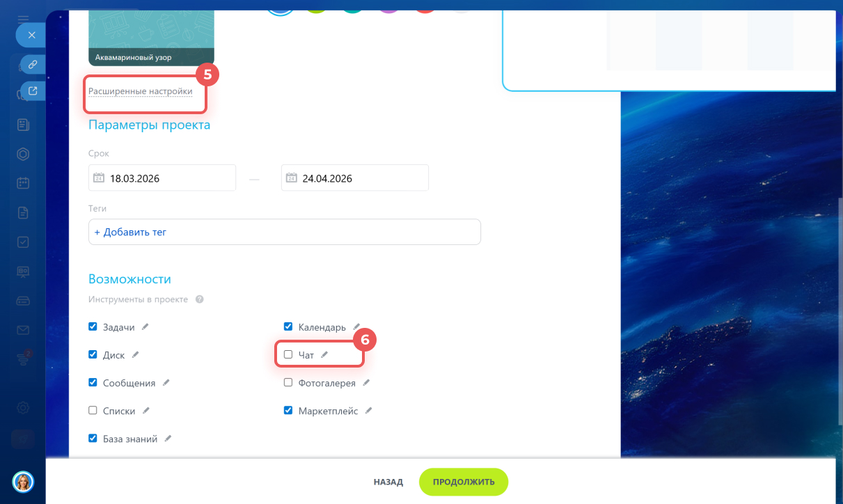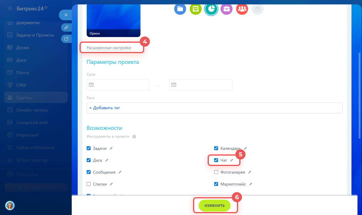 Если чат не нужен, его можно отключить при создании или редактировании группы или проекта.