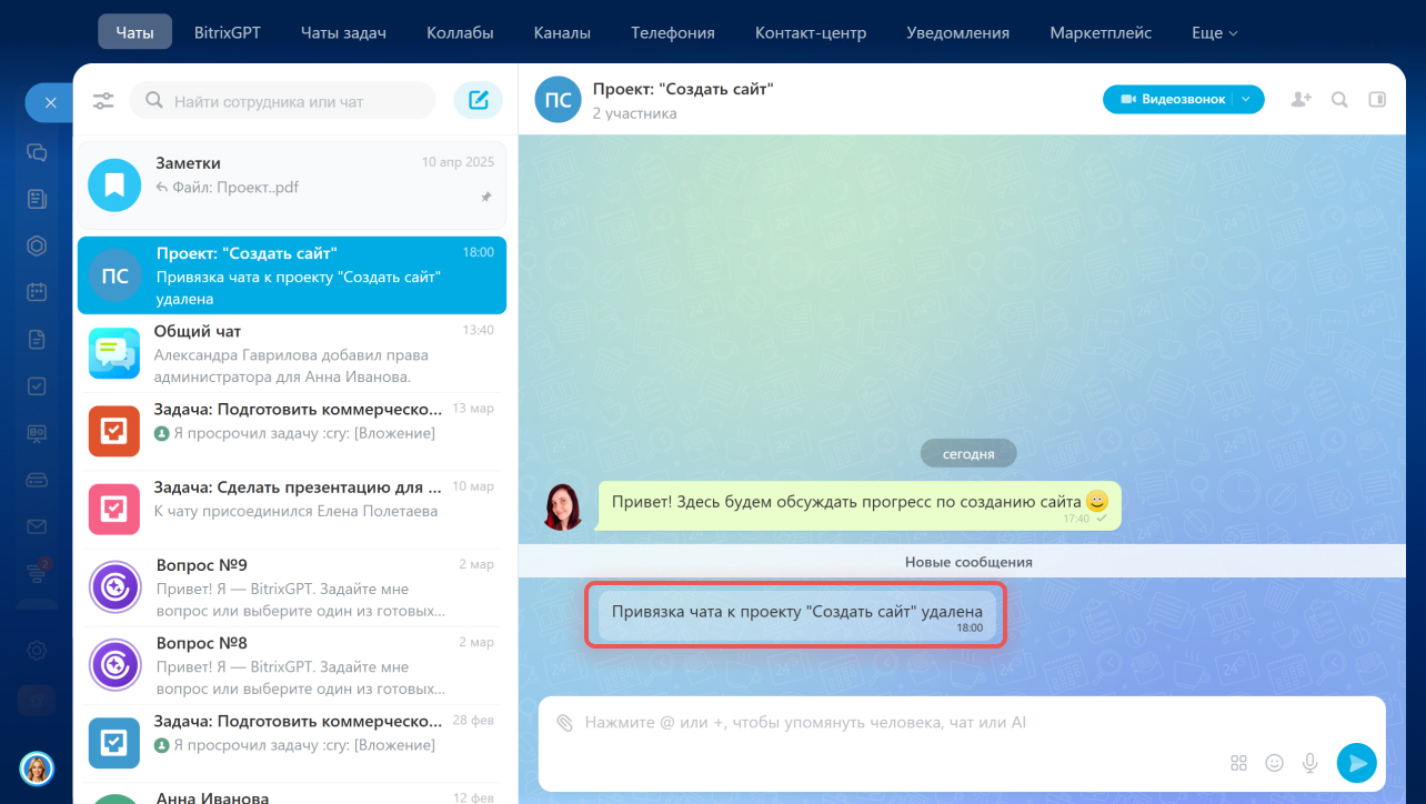 После отключения чат перестанет быть связан с группой или проектом. В чате появится уведомление о том, что привязка удалена. Чат при этом не исчезнет: он останется в списке с теми же участниками и историей сообщений.