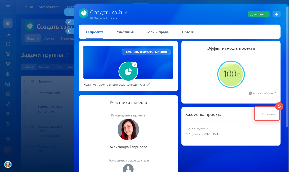 5. В разделе Свойства группы или Свойства проекта нажмите Изменить.