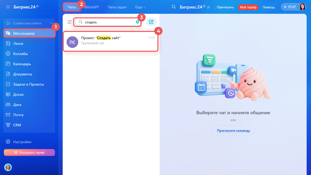 - Чат можно найти в Мессенджере через поиск или открыть внутри группы или проекта.