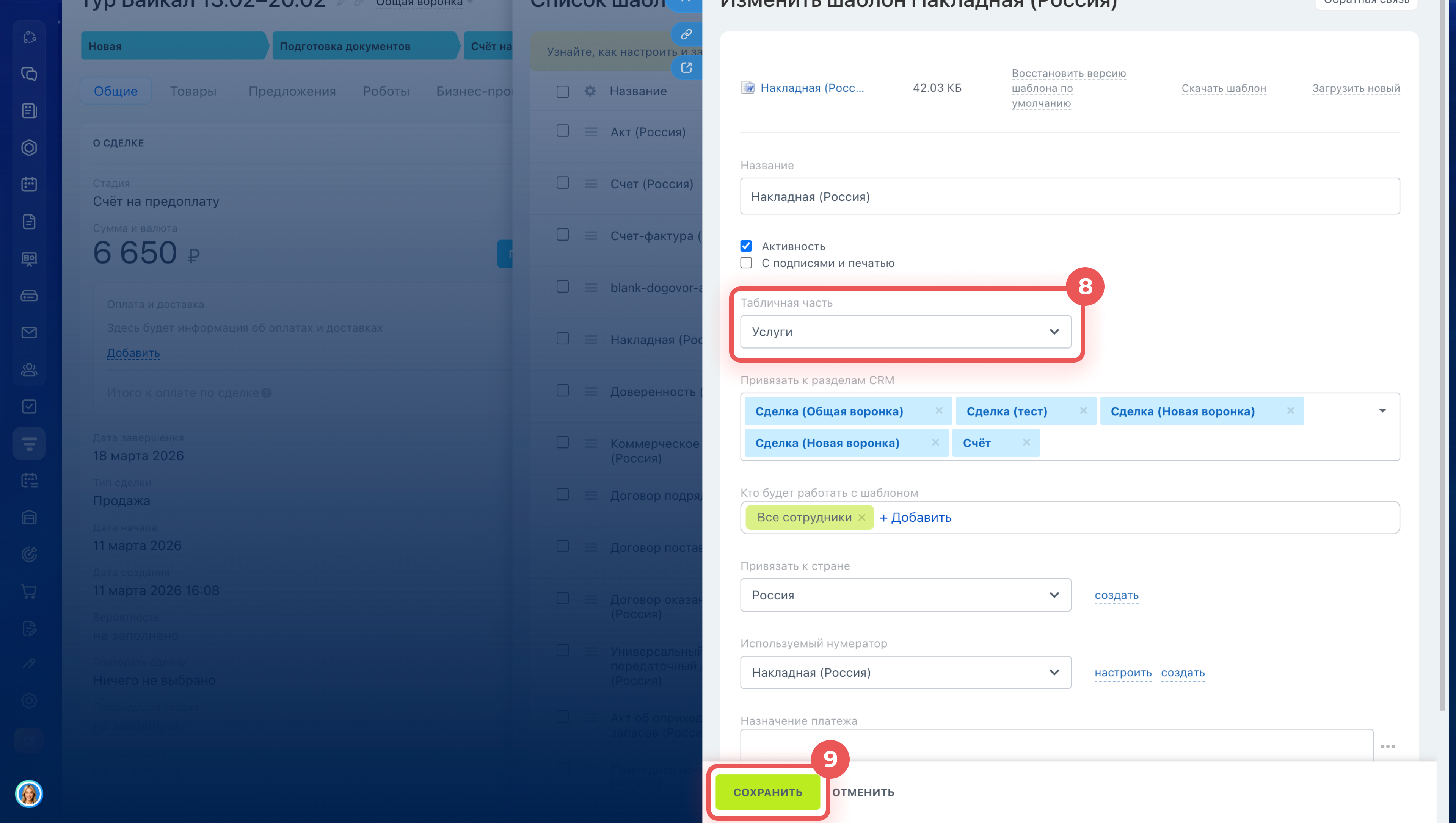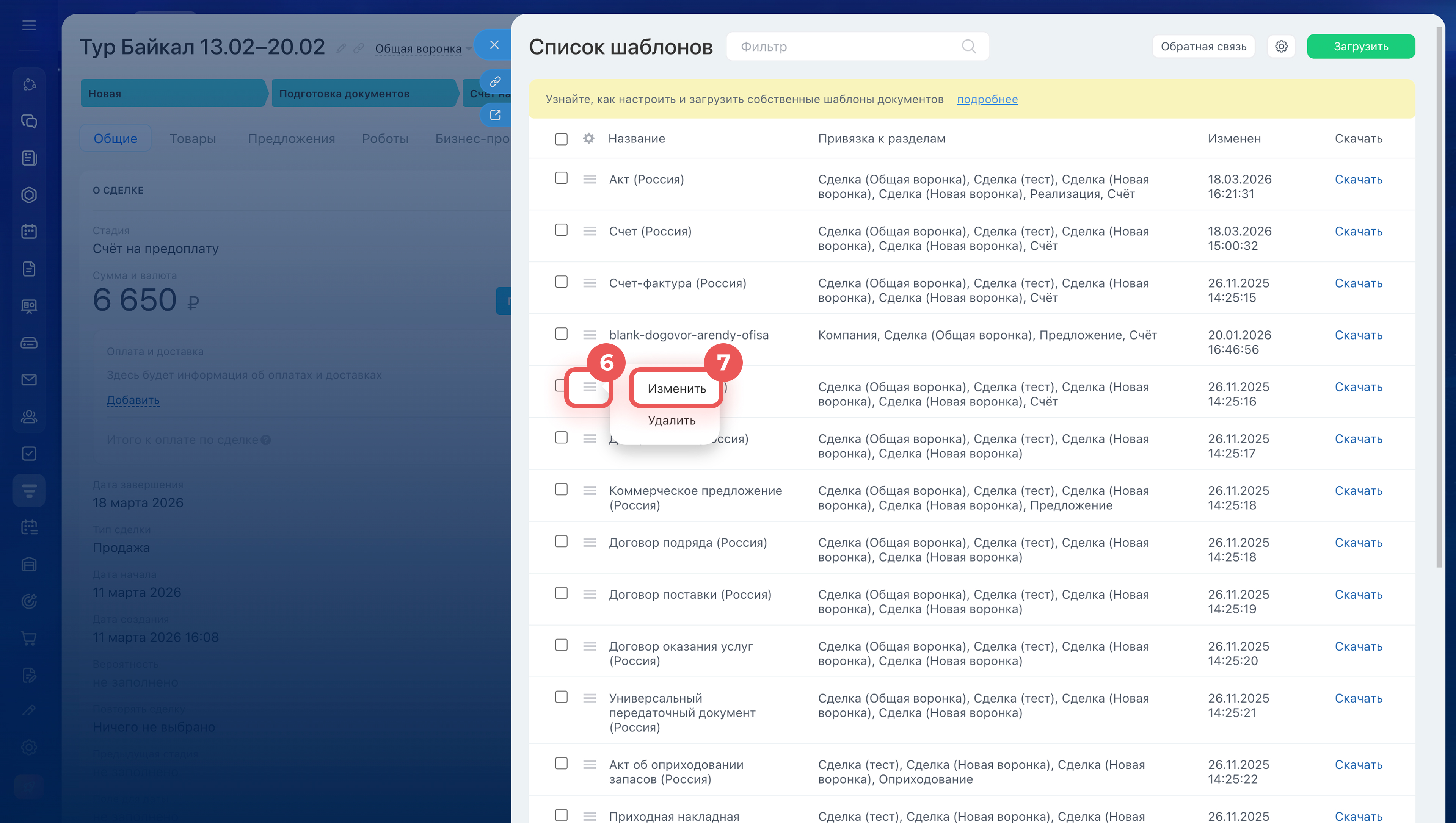 - Чтобы настроить табличную часть, перейдите в CRM > Сделки и откройте любую сделку. В карточке сделки нажмите Документ > Добавить новый шаблон. Слева от нужного шаблона нажмите Меню (≡) > Изменить. В поле Табличная часть выберите нужный вариант и сохраните шаблон.