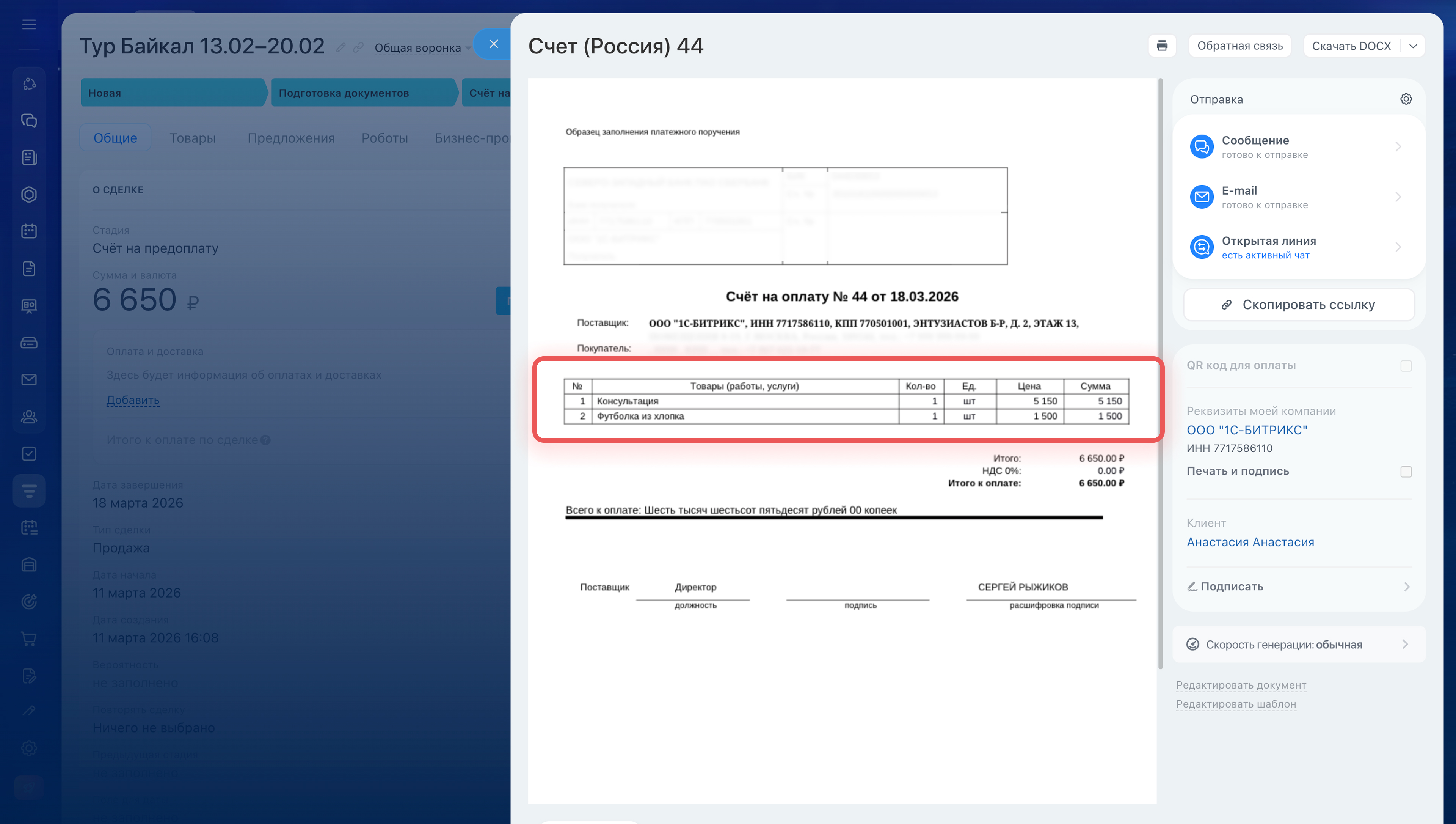 В шаблонах документов можно настроить, какие позиции из карточки CRM попадут в документ — только товары, только услуги или оба типа сразу. Это позволяет автоматически формировать документы под разные задачи.