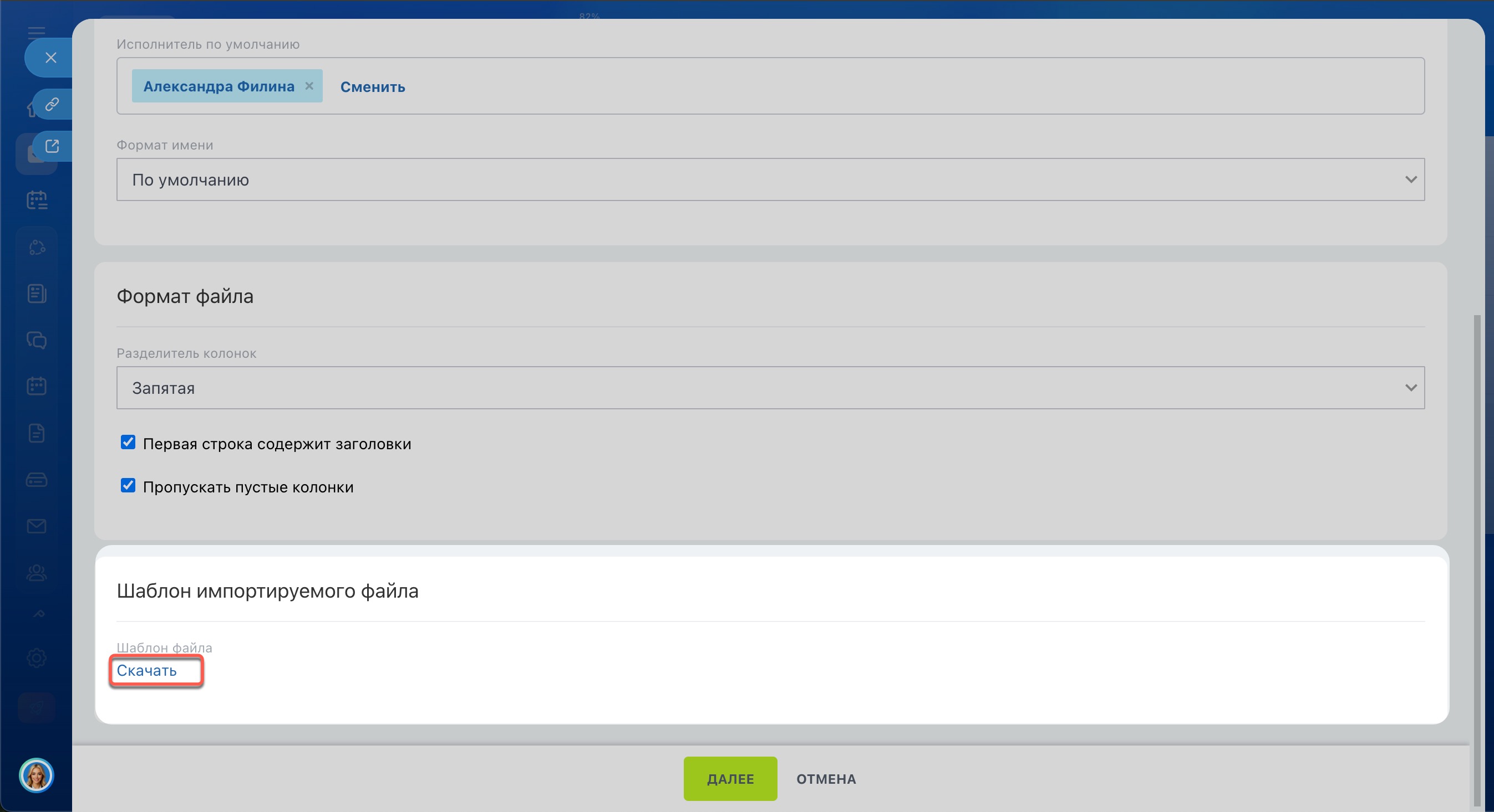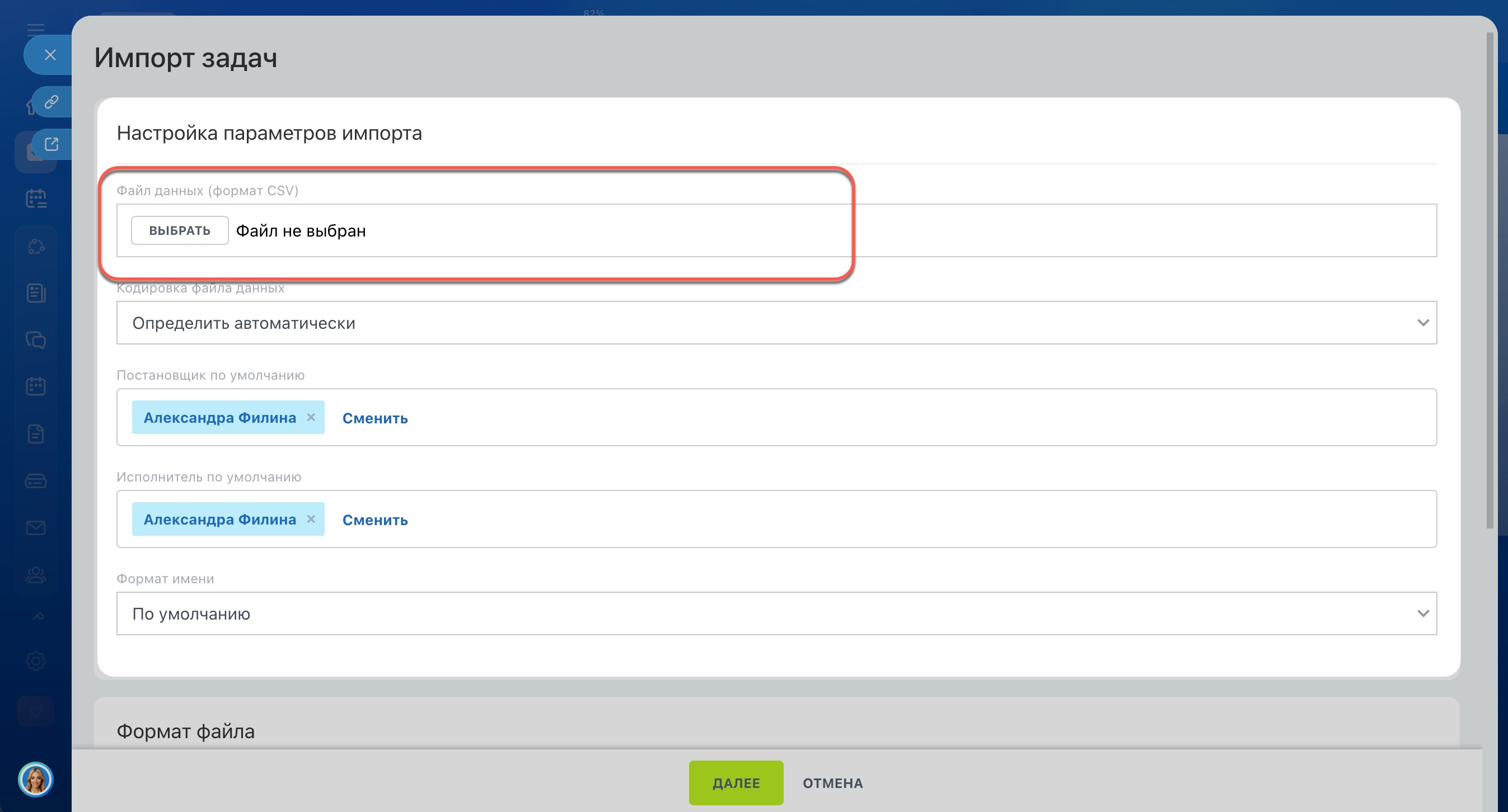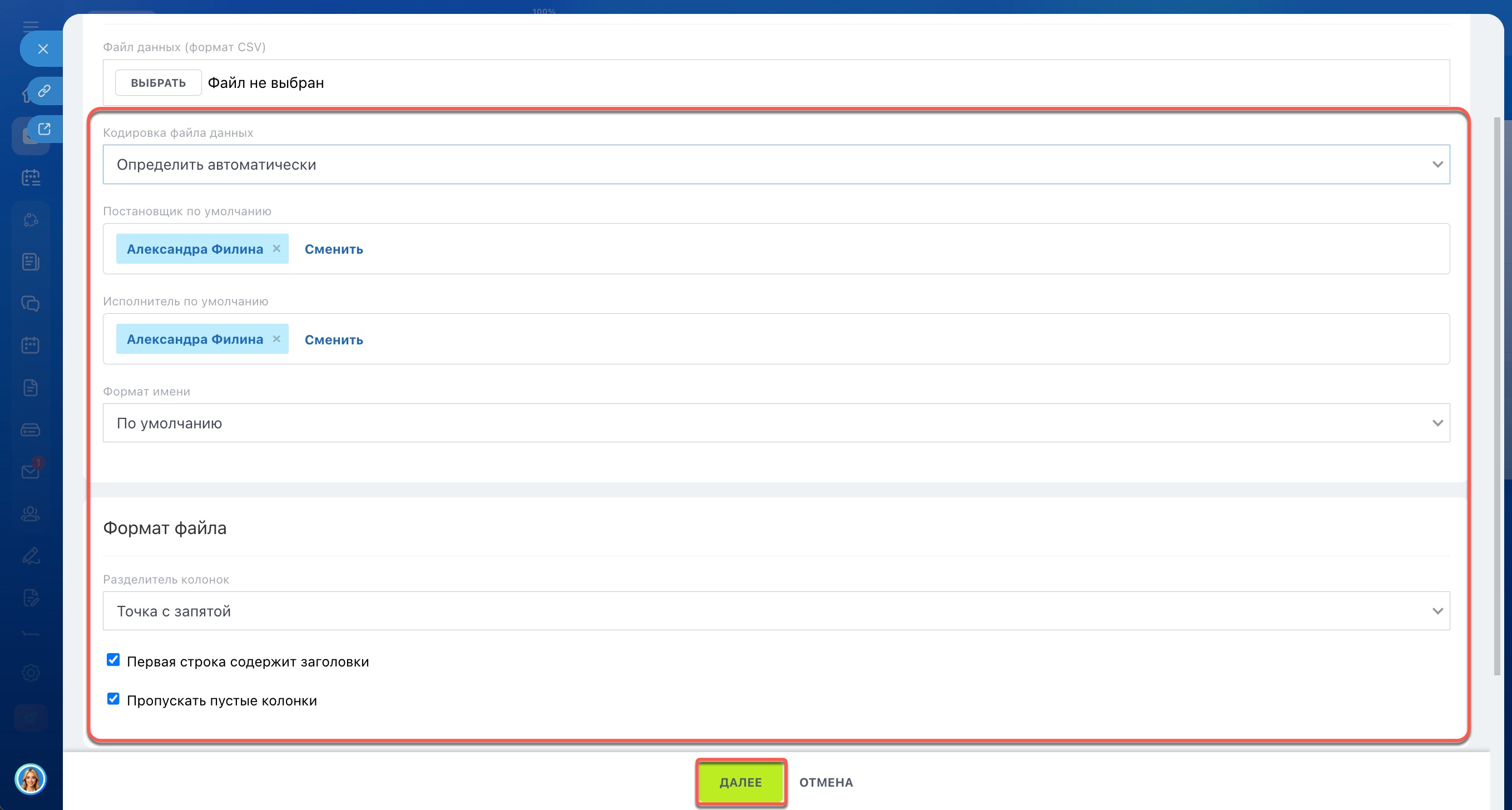 - Исполнитель по умолчанию — укажите сотрудника, который станет исполнителем, если он не указан в файле. После импорта задачи можно делегировать коллегам.