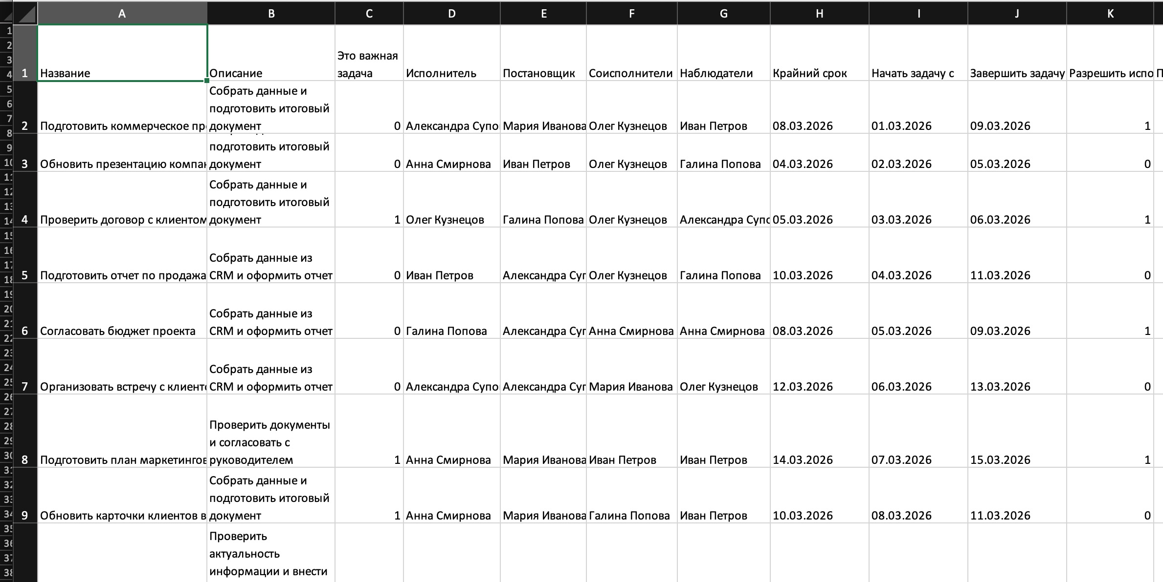 Например, если в колонке Важная задача указано значение 1, задача будет отмечена как важная.