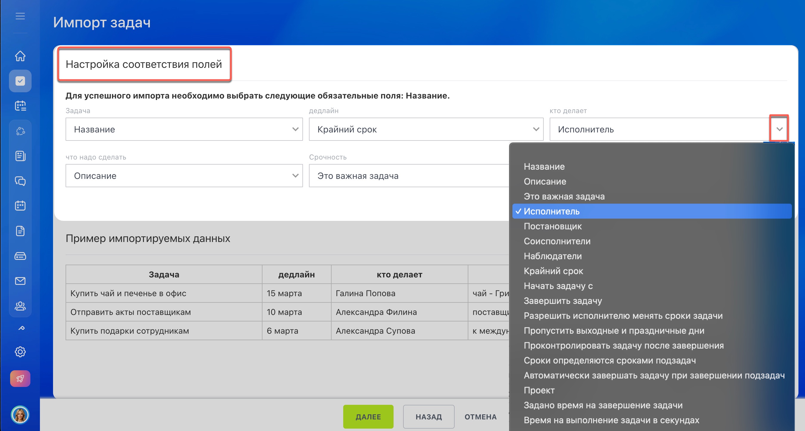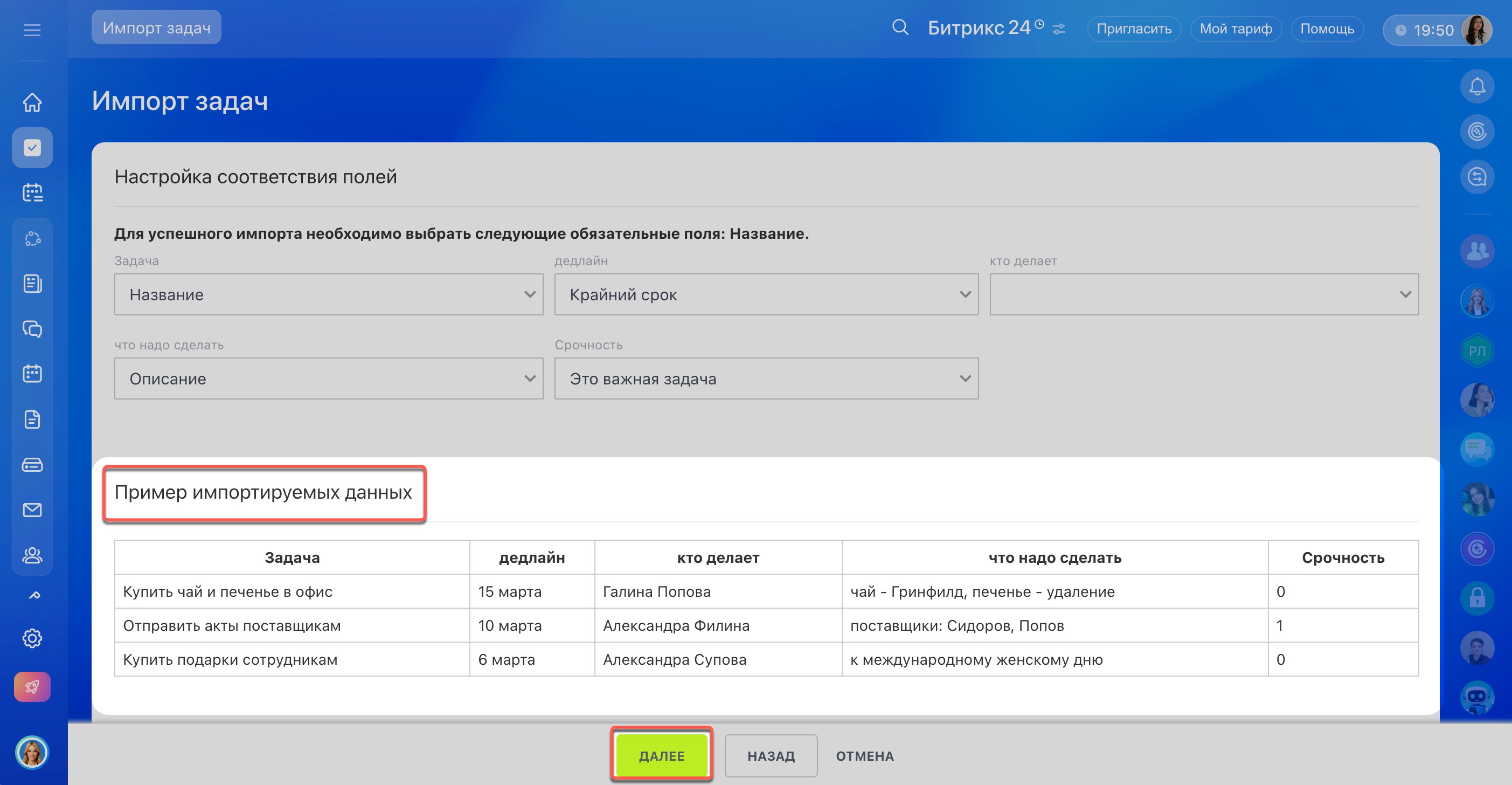 5. Проверьте, что поля из файла импорта соответствуют нужным полям в Битрикс24. Например, поле Исполнитель из файла соответствует такому же полю в карточке задачи.