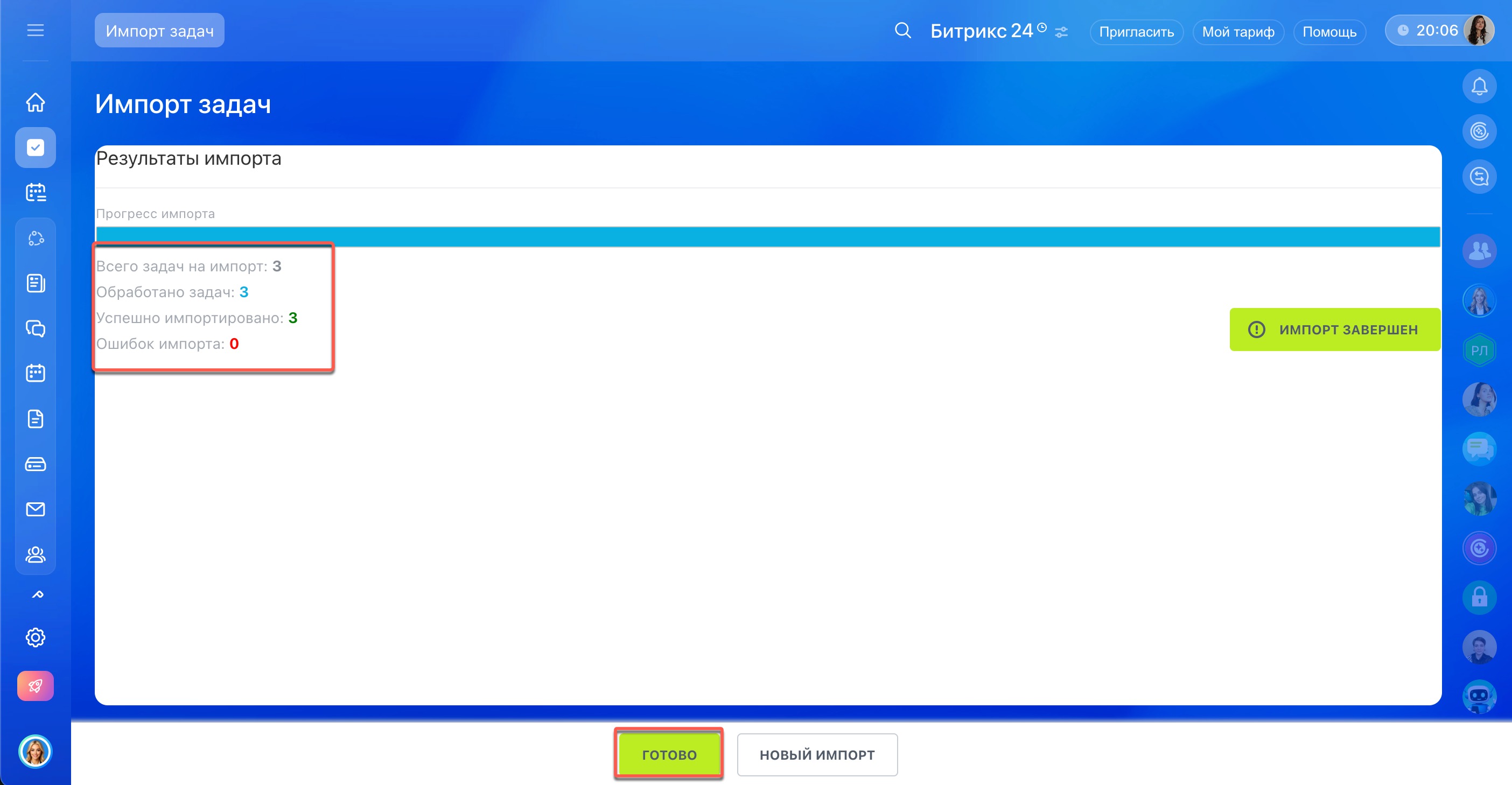 6. Дождитесь загрузки данных. На странице показано, сколько задач было в файле и сколько загружено в Битрикс24. Если при импорте возникли ошибки, они тоже отобразятся. Чем больше задач импортируете, тем больше времени может занять этот процесс.