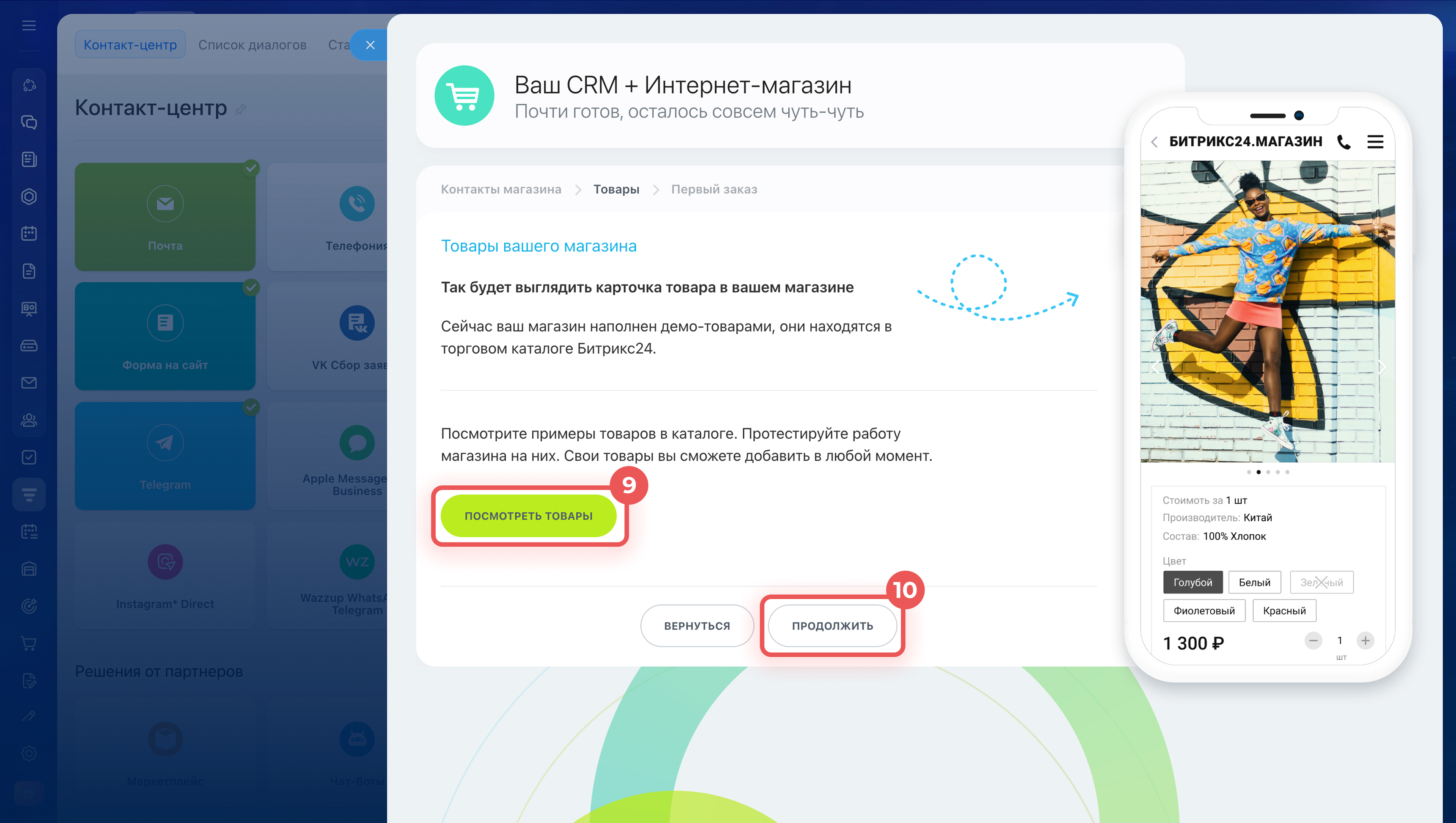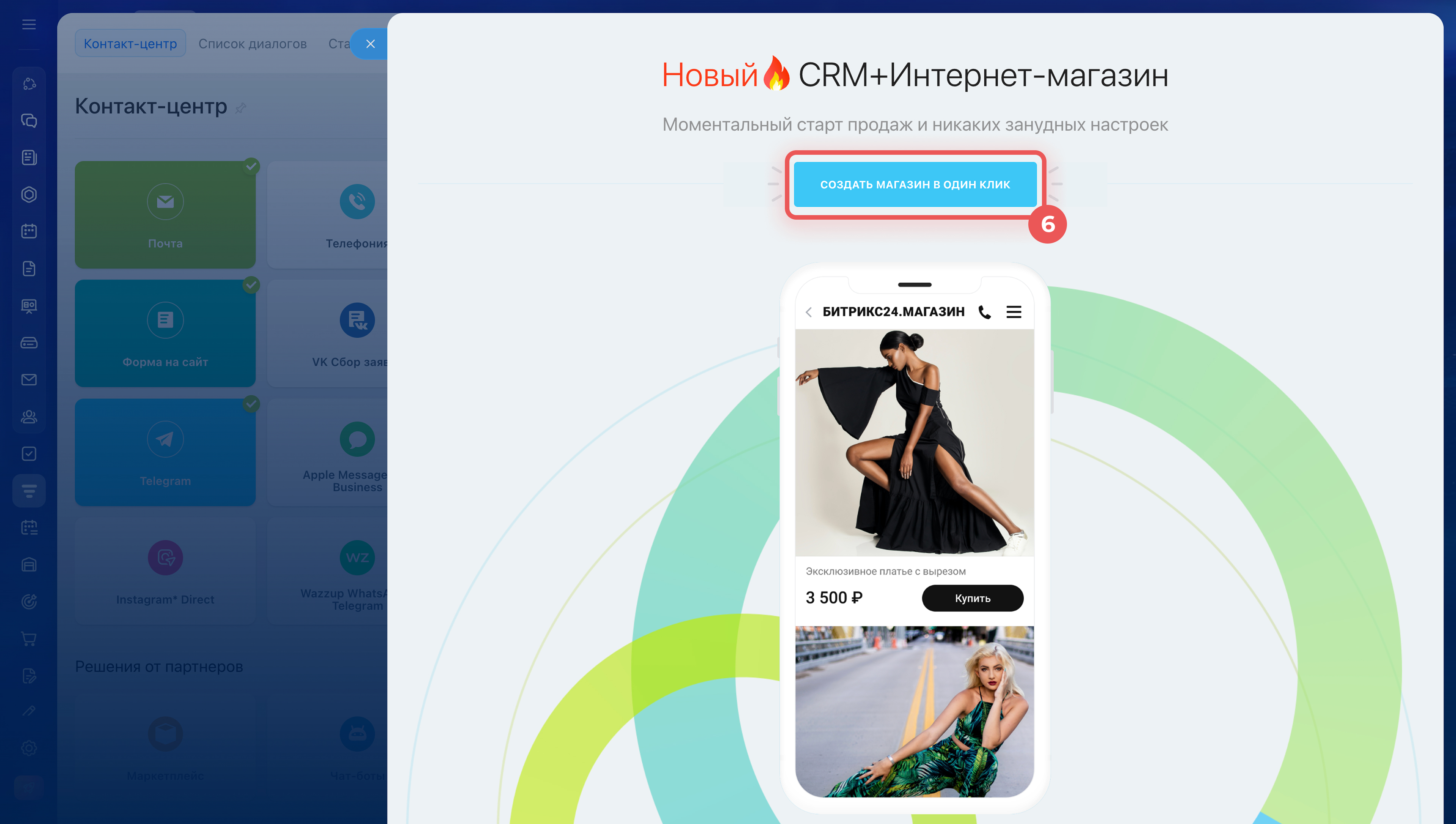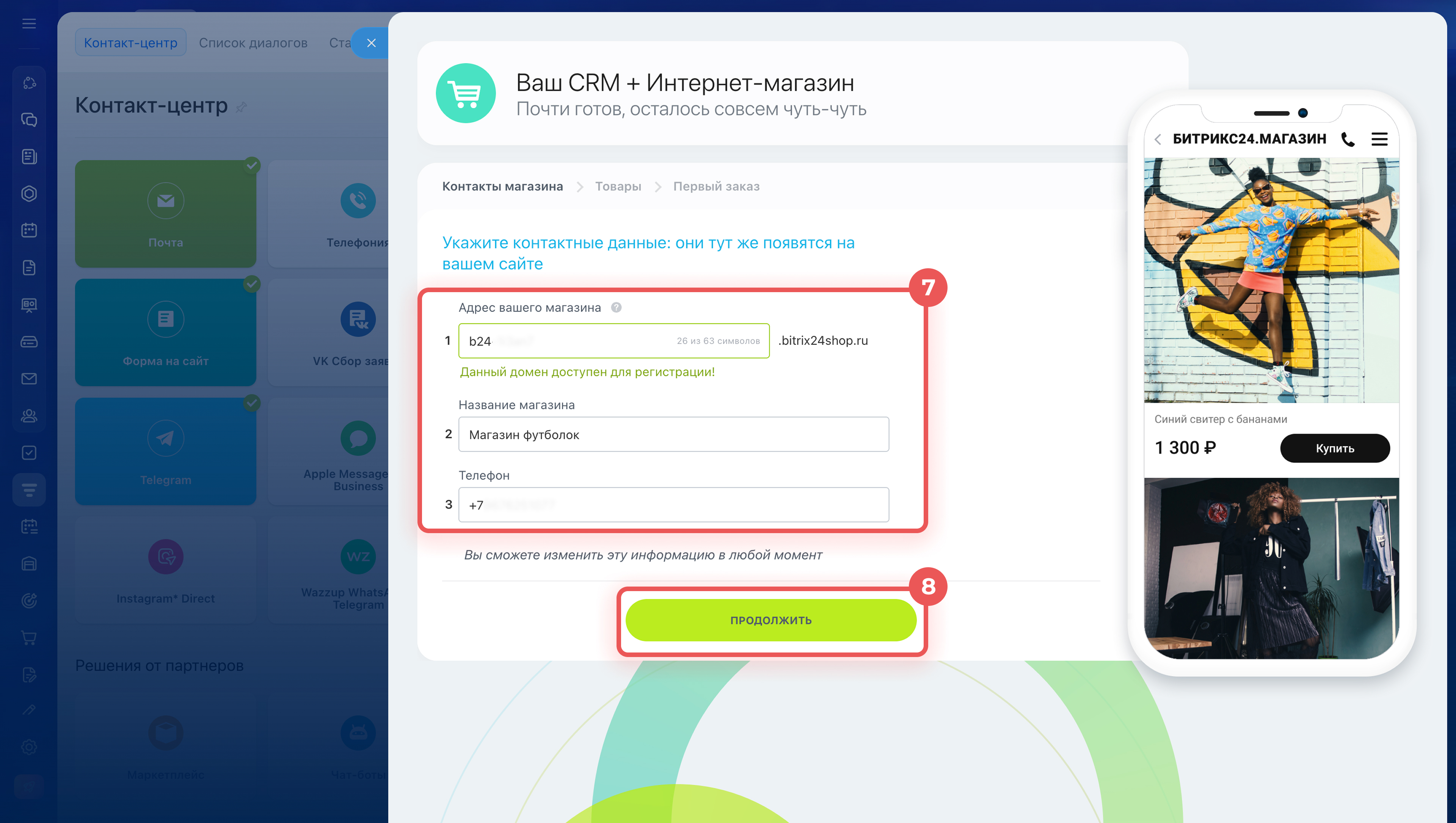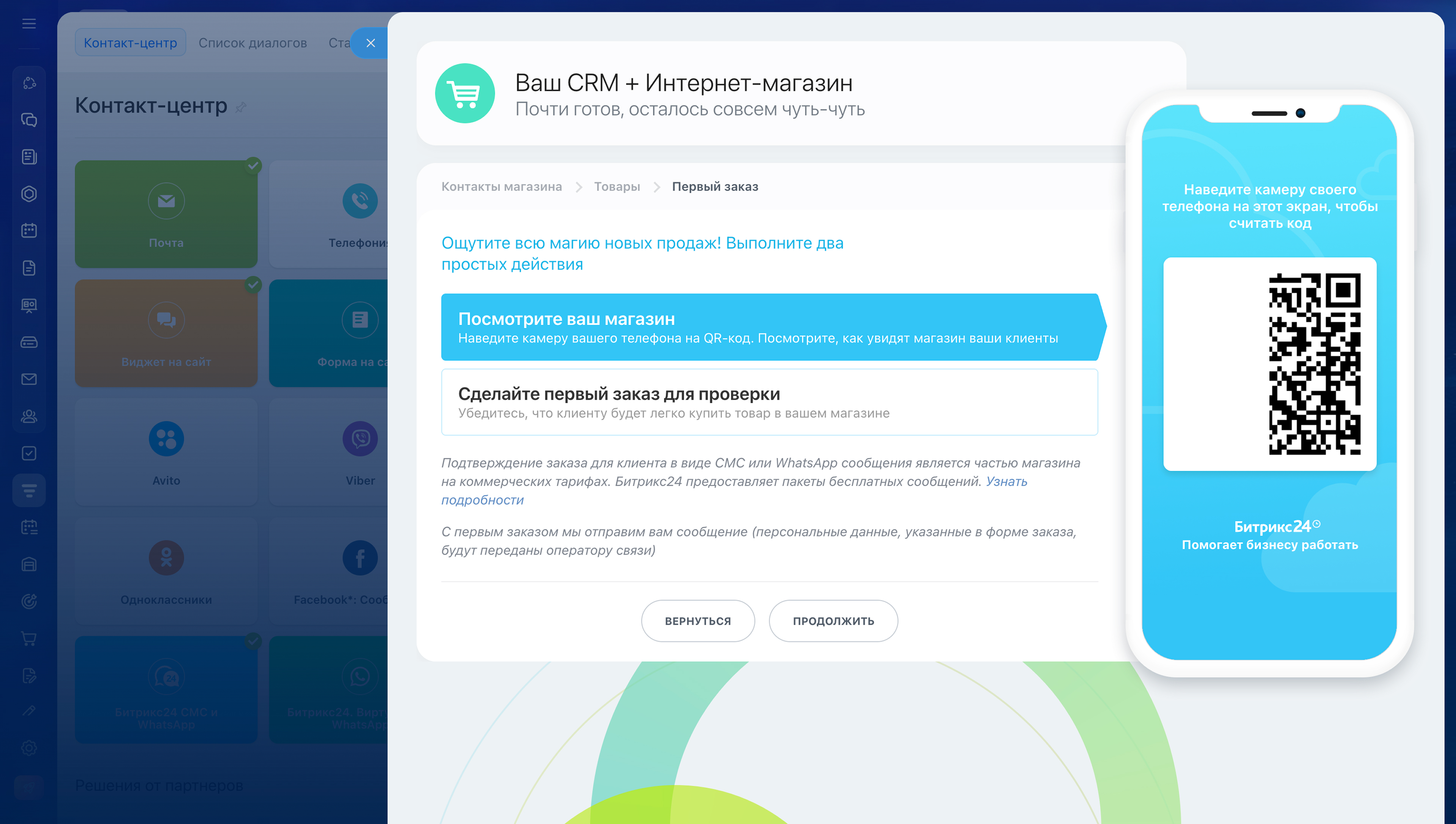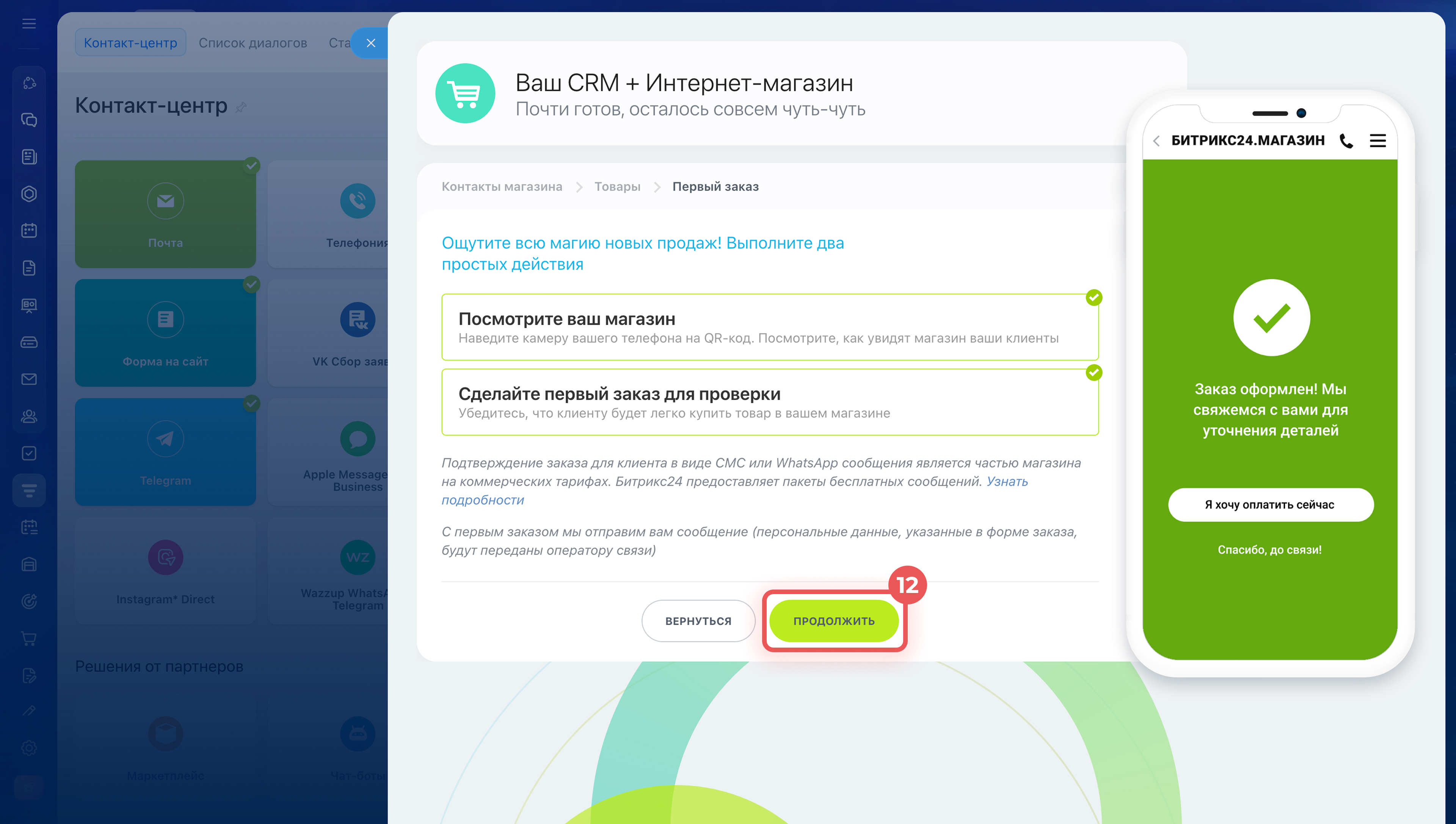 - Магазин создается за несколько минут в разделе CRM > Продажи > Каналы продаж > Контакт-центр. После создания его можно сразу проверить — оформить тестовый заказ.