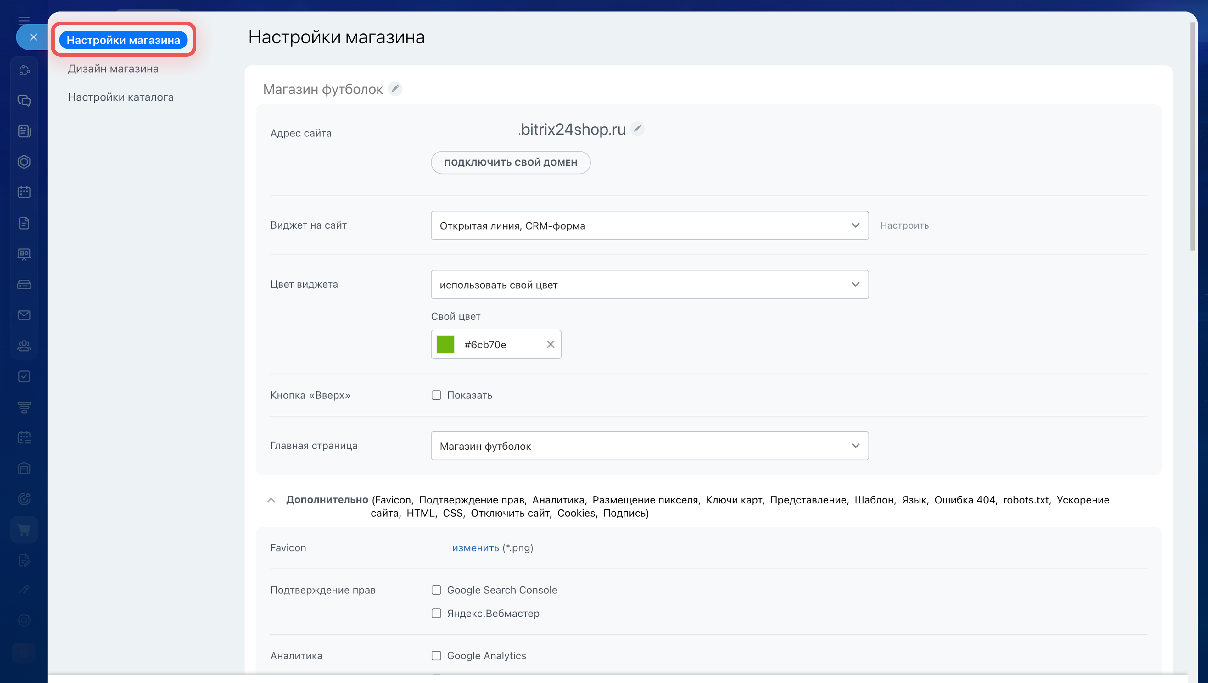 - Во вкладке Настройки магазина меняют домен, главную страницу, виджет для связи с клиентами и другое.