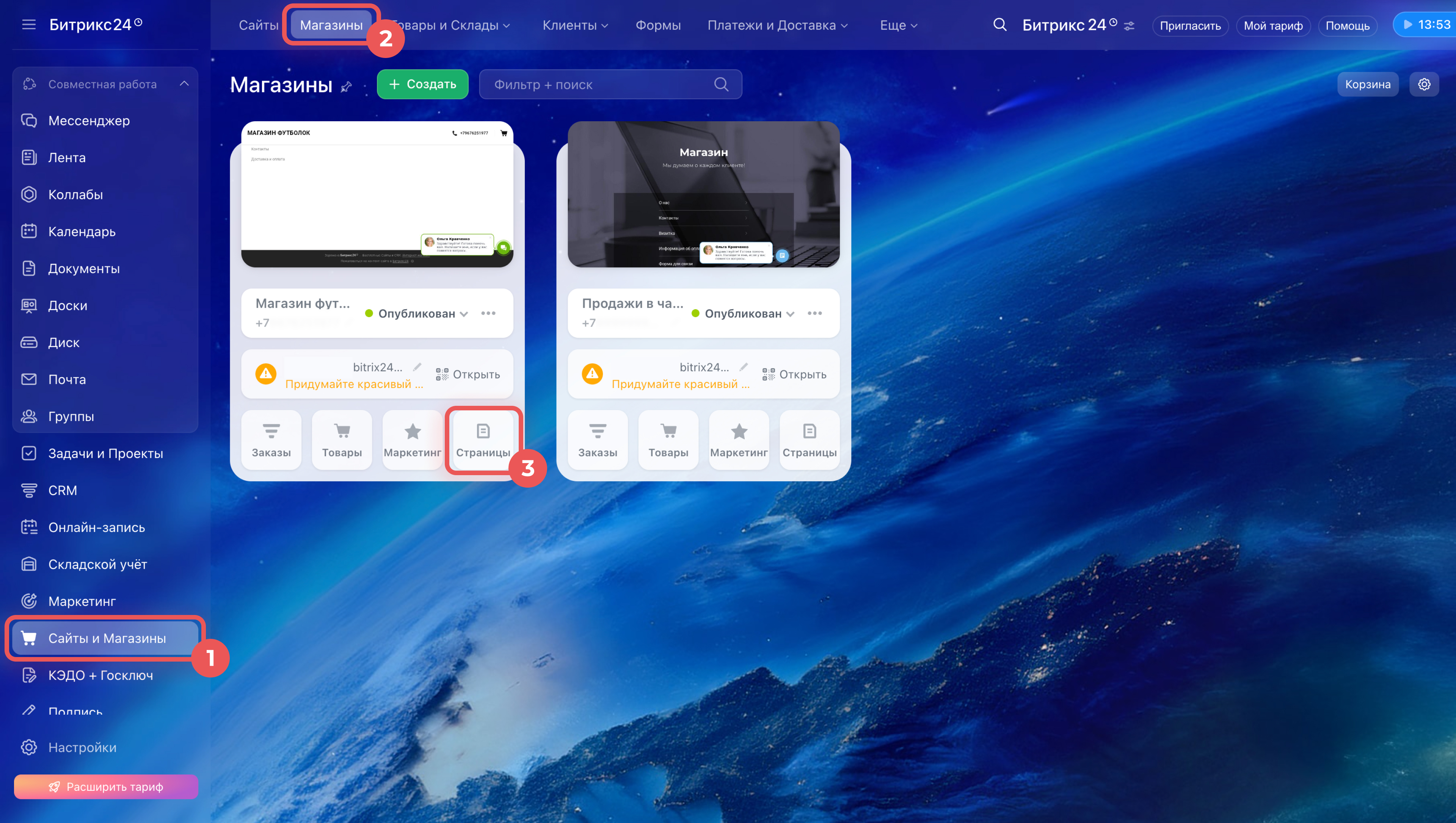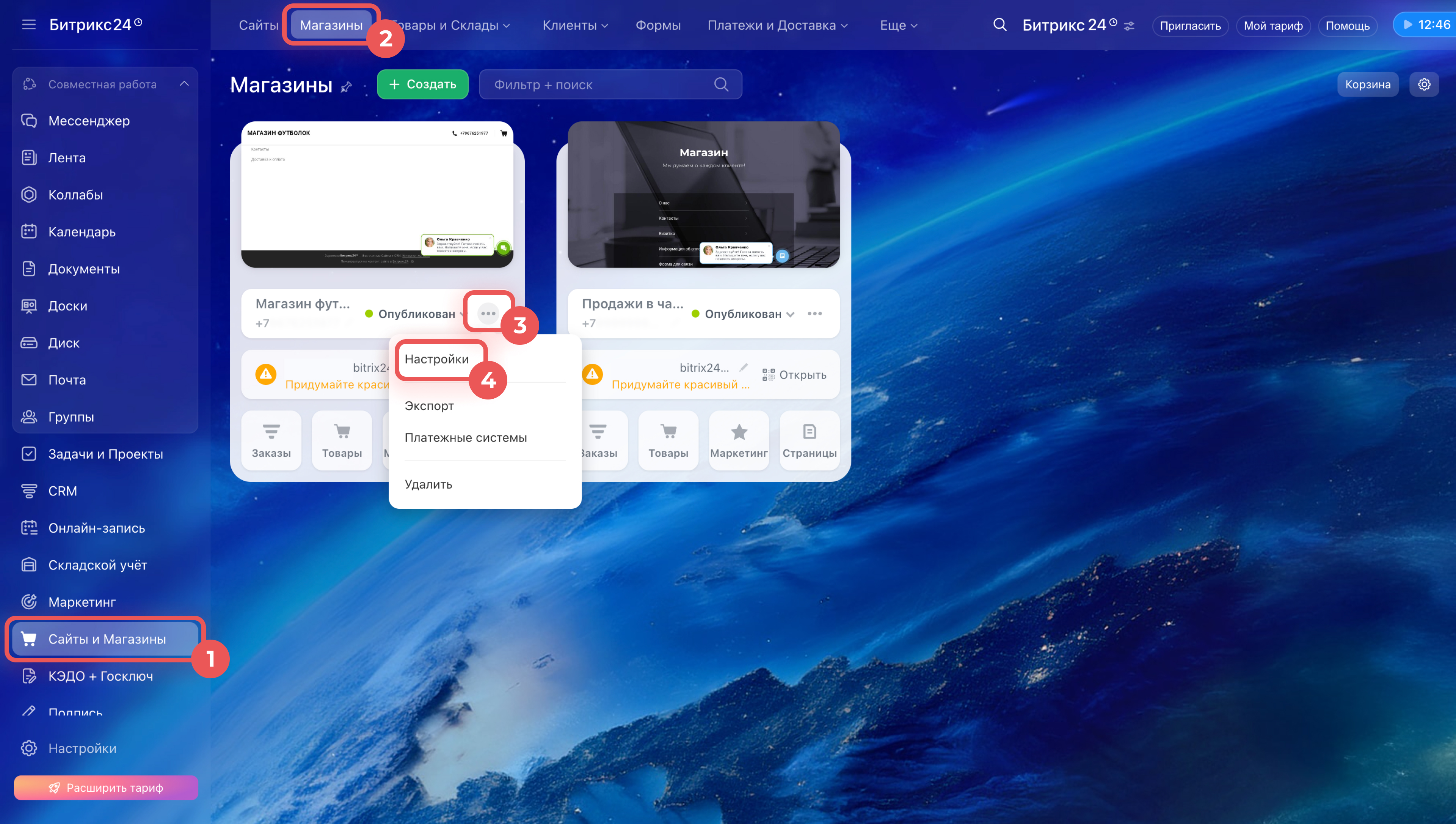 1–2. Перейдите в Сайты и Магазины > Магазины.
