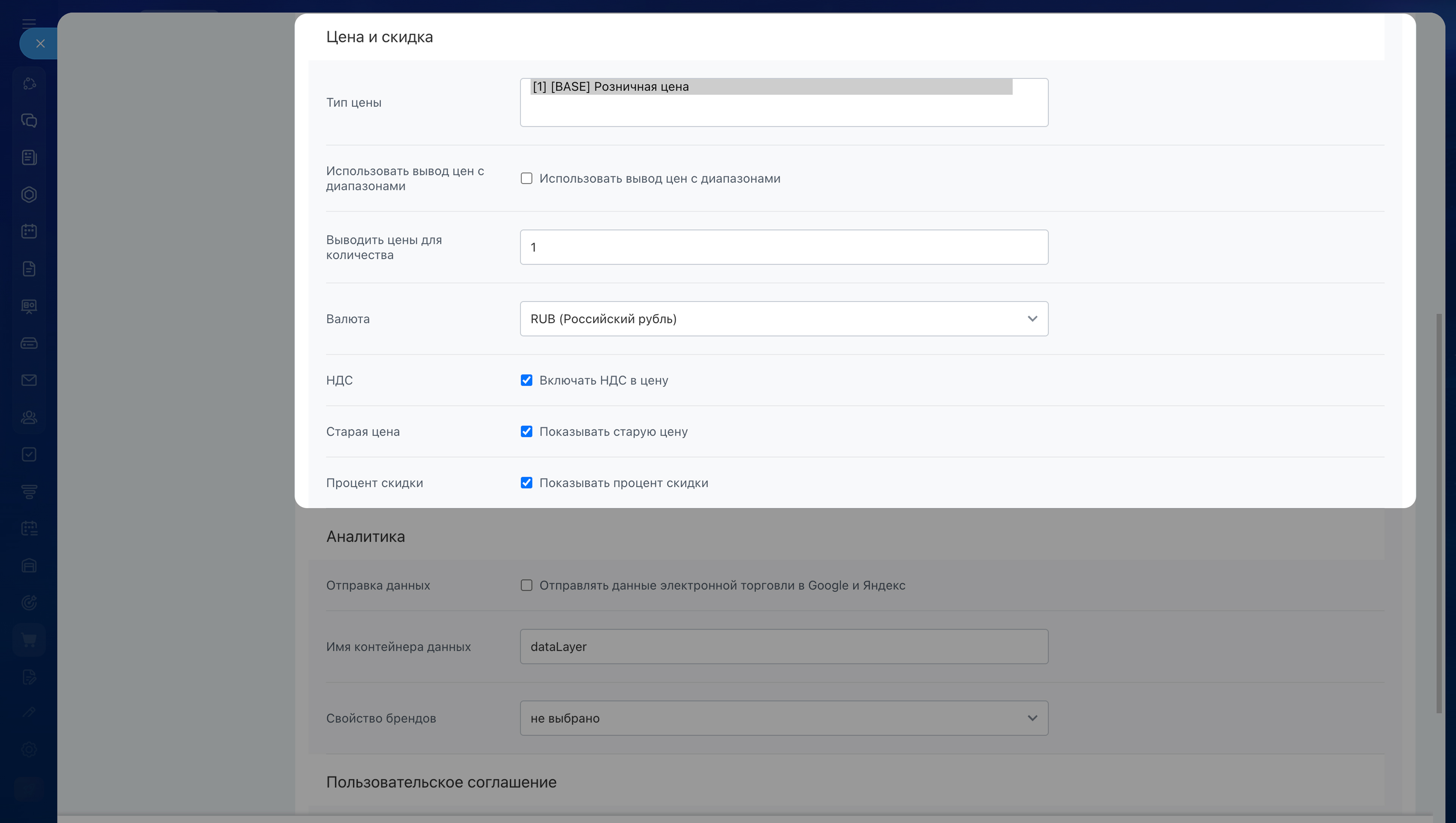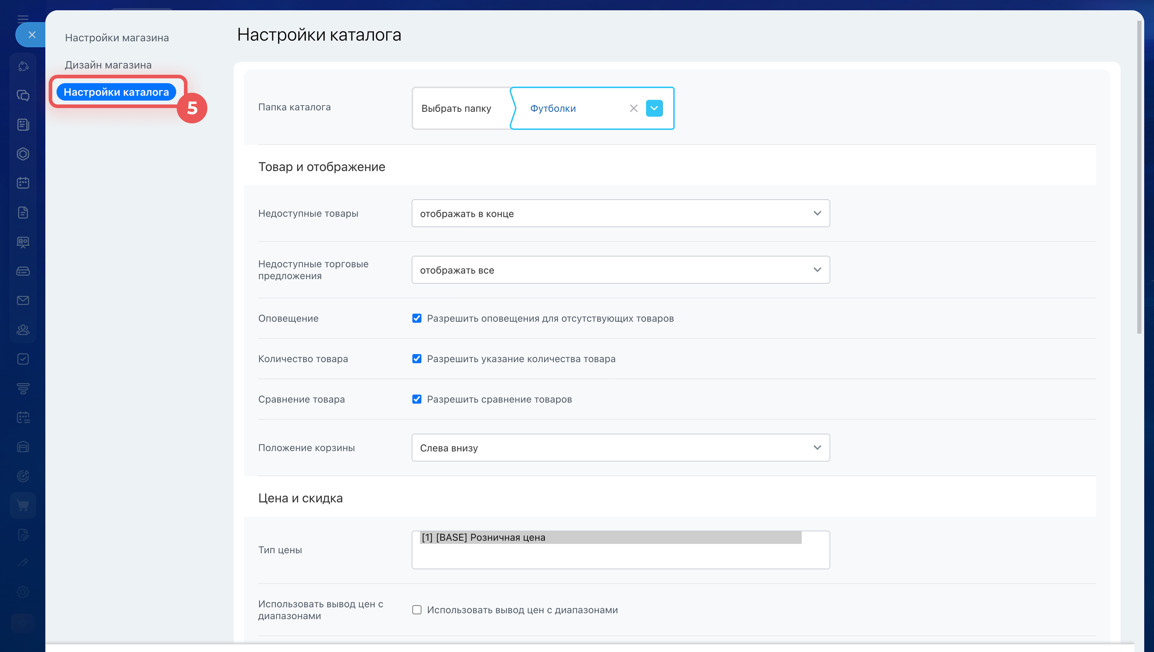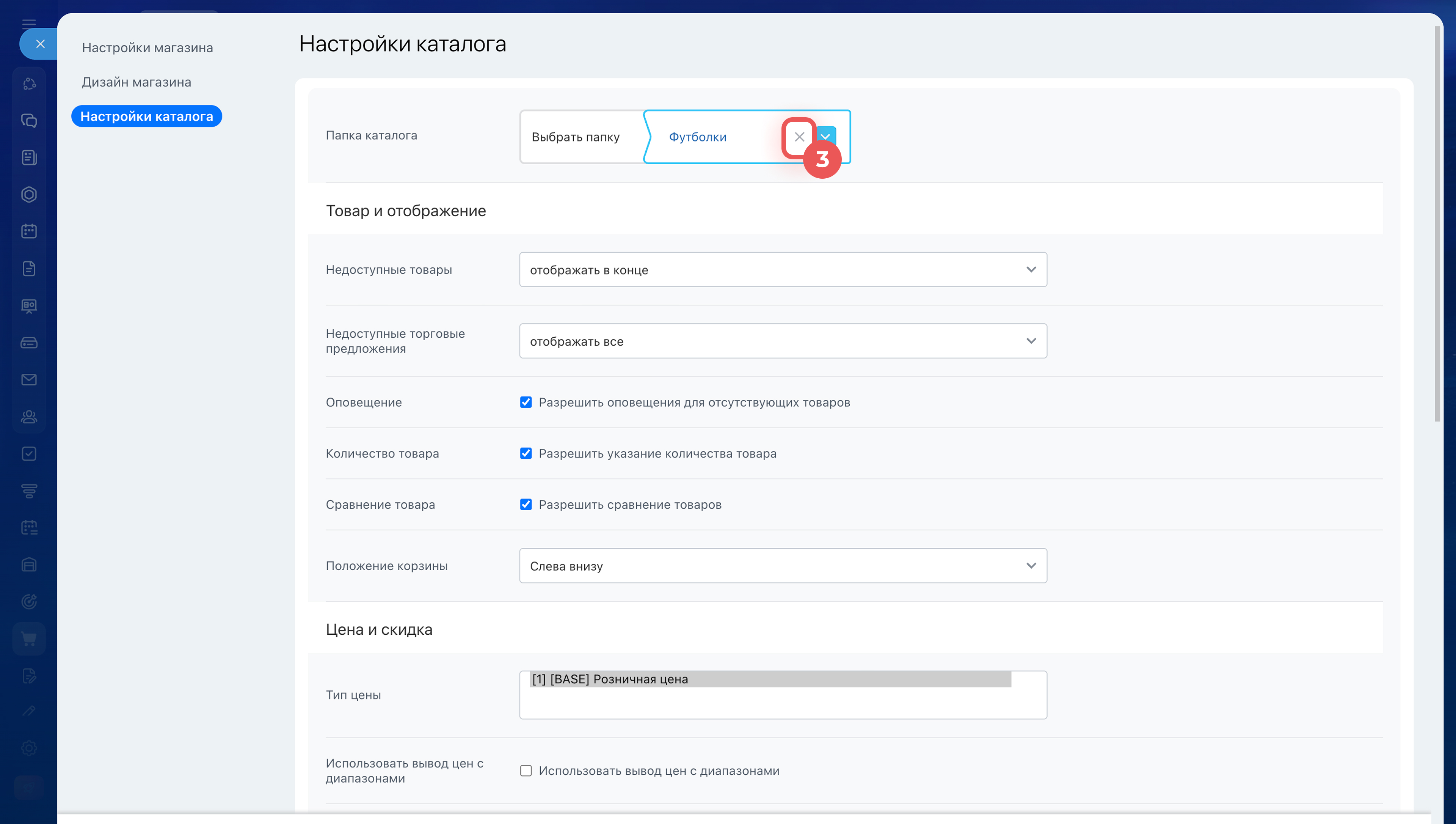 Цена и скидки. В этом блоке можно настроить, как цены будут отображаться для клиентов.