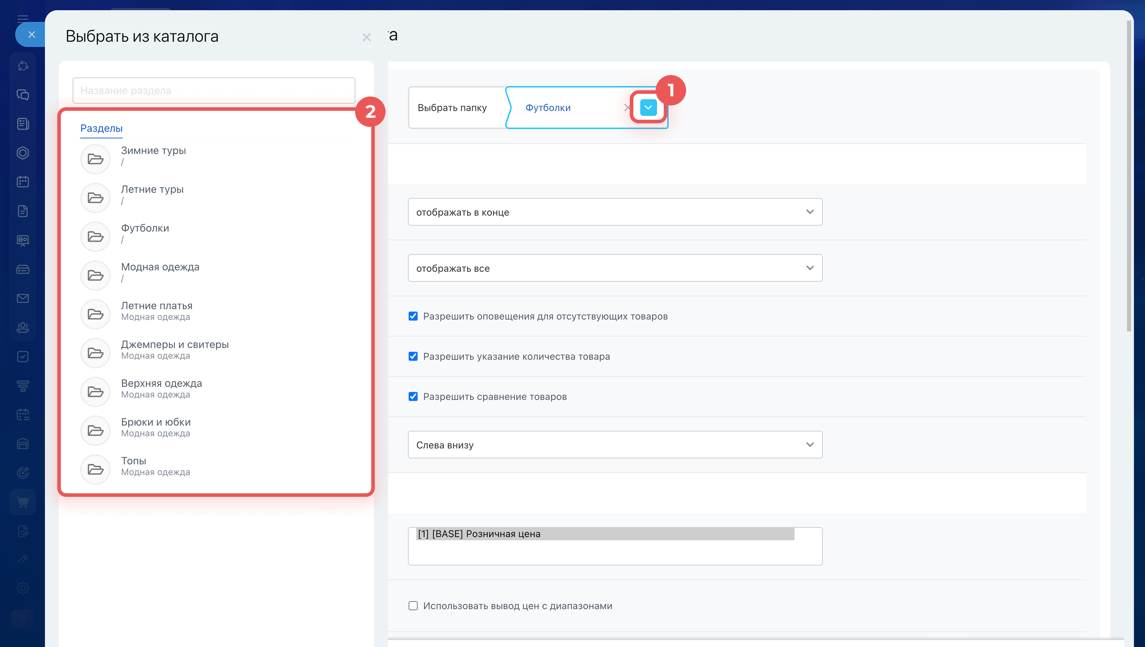 рядом с названием папки и выберите раздел каталога, товары из которого будут показаны в магазине. Например, можно показать только категорию Верхняя одежда. При изменении папки меняется список товаров на сайте.