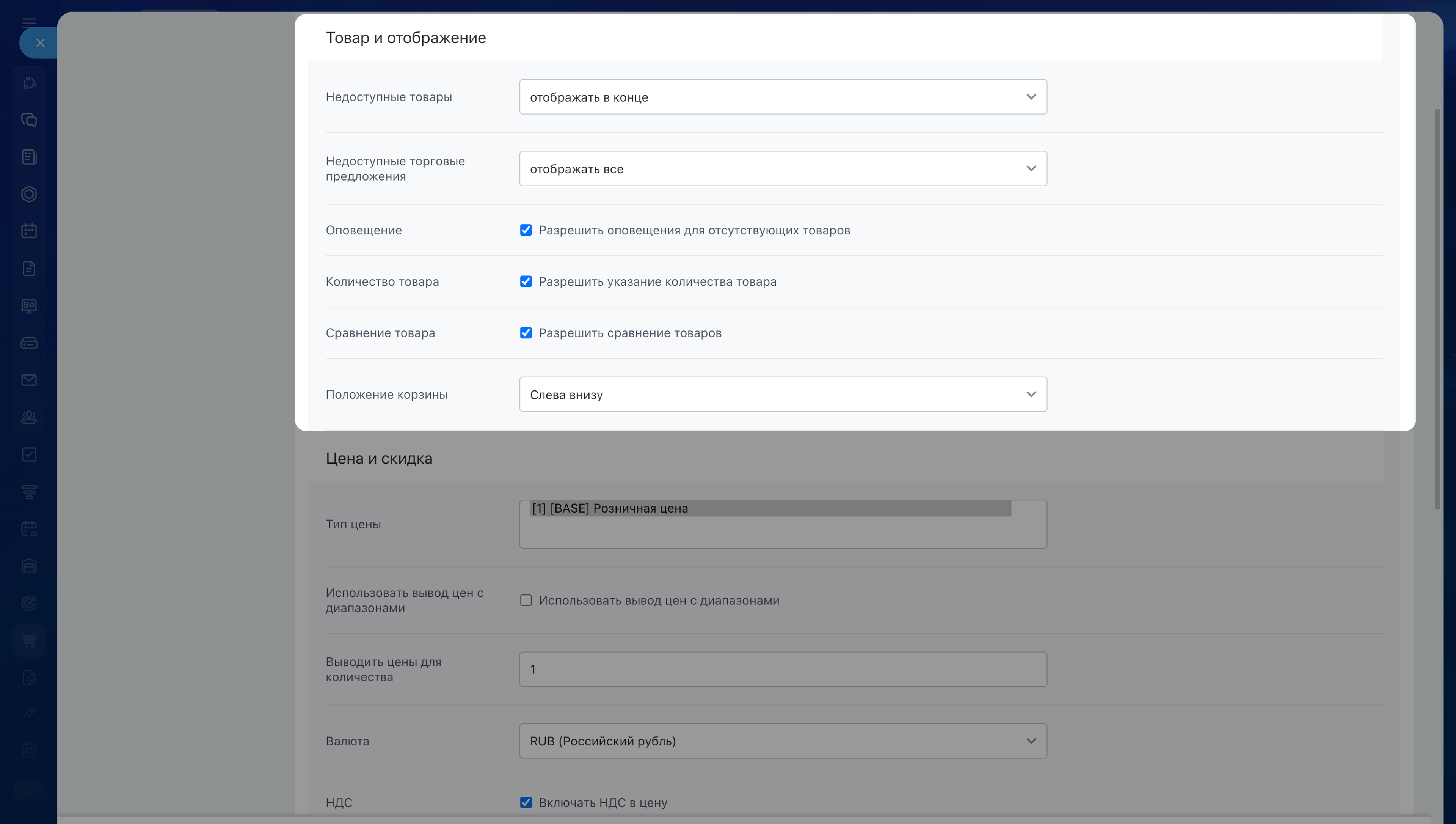 - НДС — включите отображение цен с учетом НДС при необходимости.