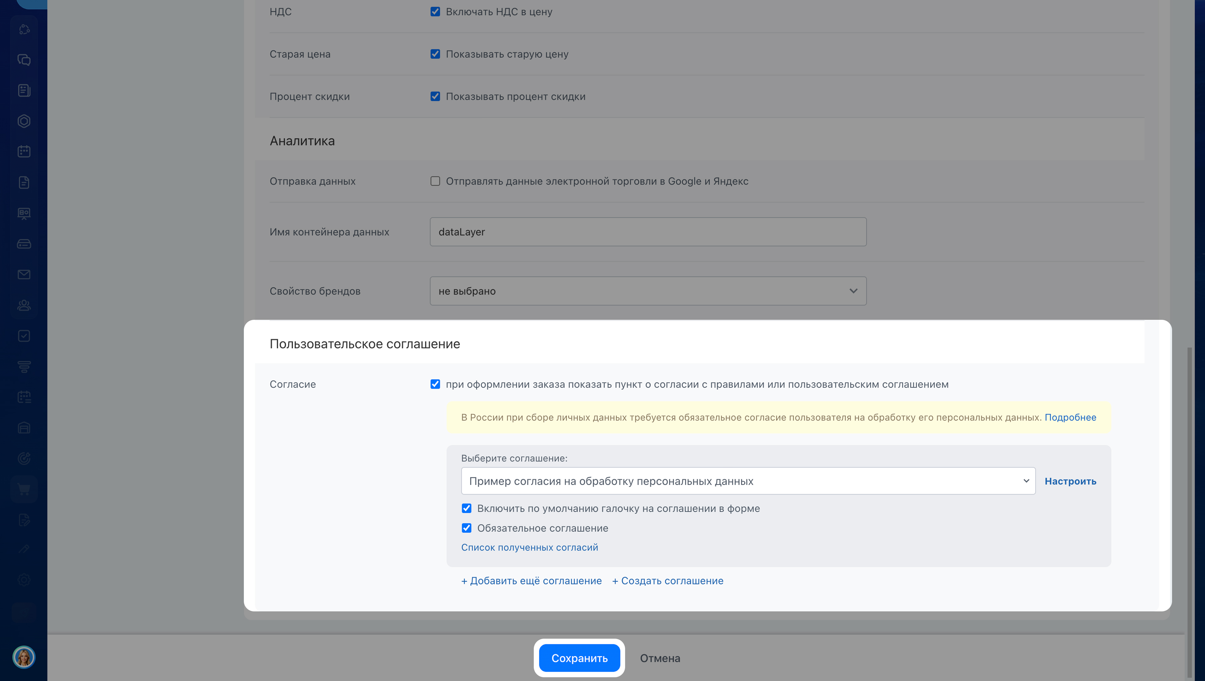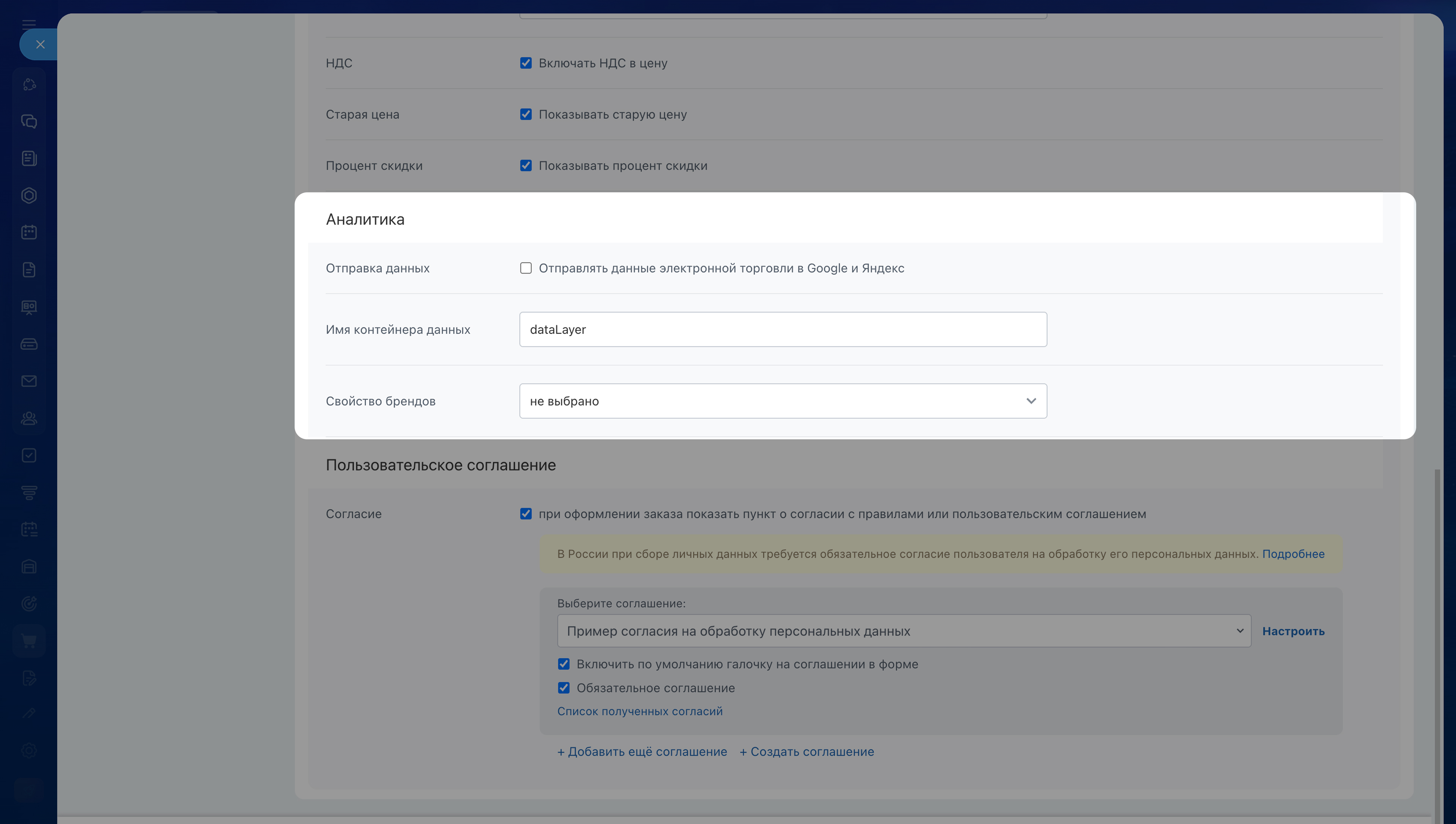 1. Включите показ согласия при оформлении заказа.