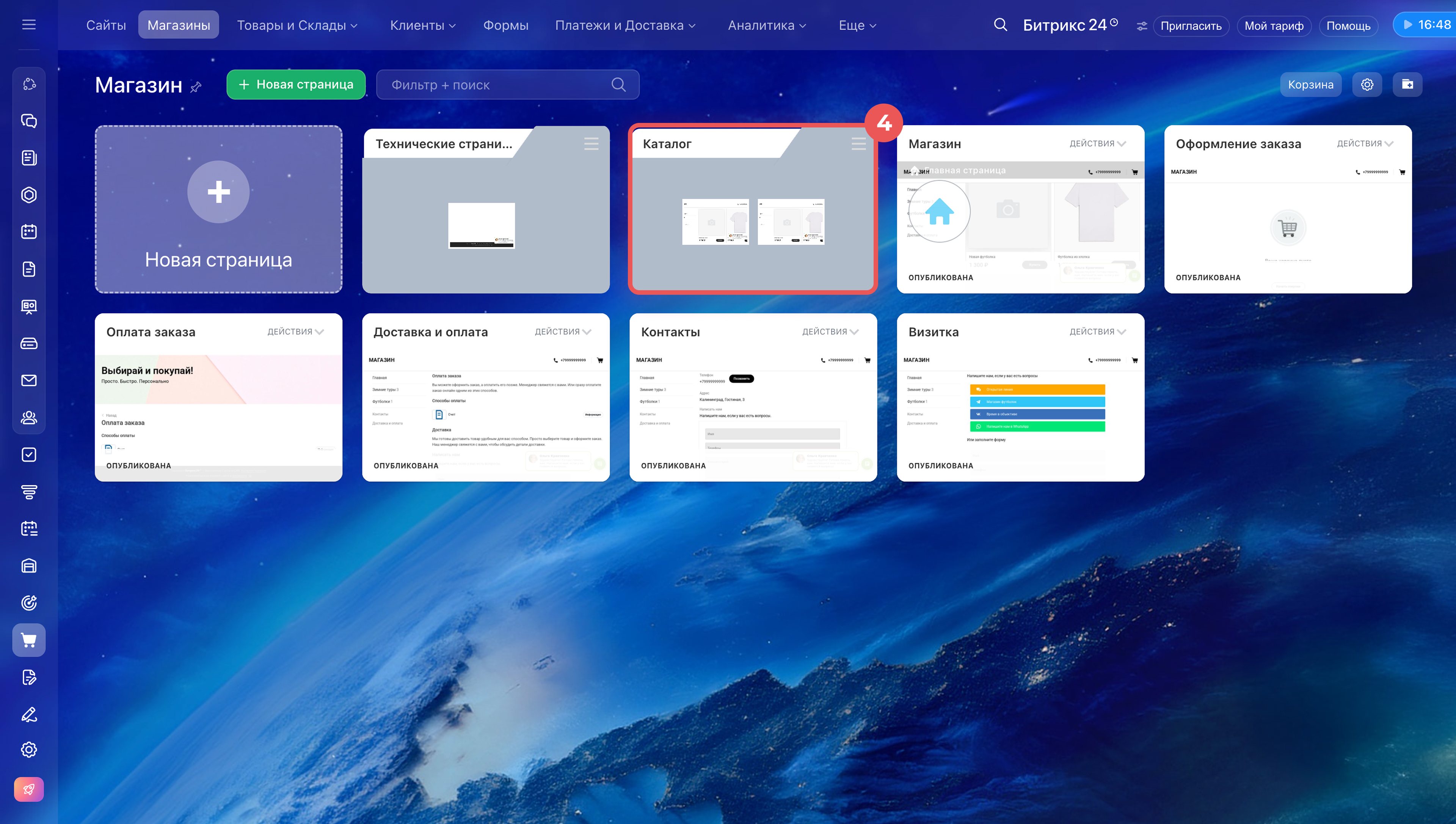 - Страницы магазина настраиваются отдельно. Для этого перейдите в Сайты и Магазины > Магазины. Около нужного магазина нажмите Страницы. Здесь редактируют страницы магазина: каталог, карточку товара, оформление заказа и другие разделы сайта.