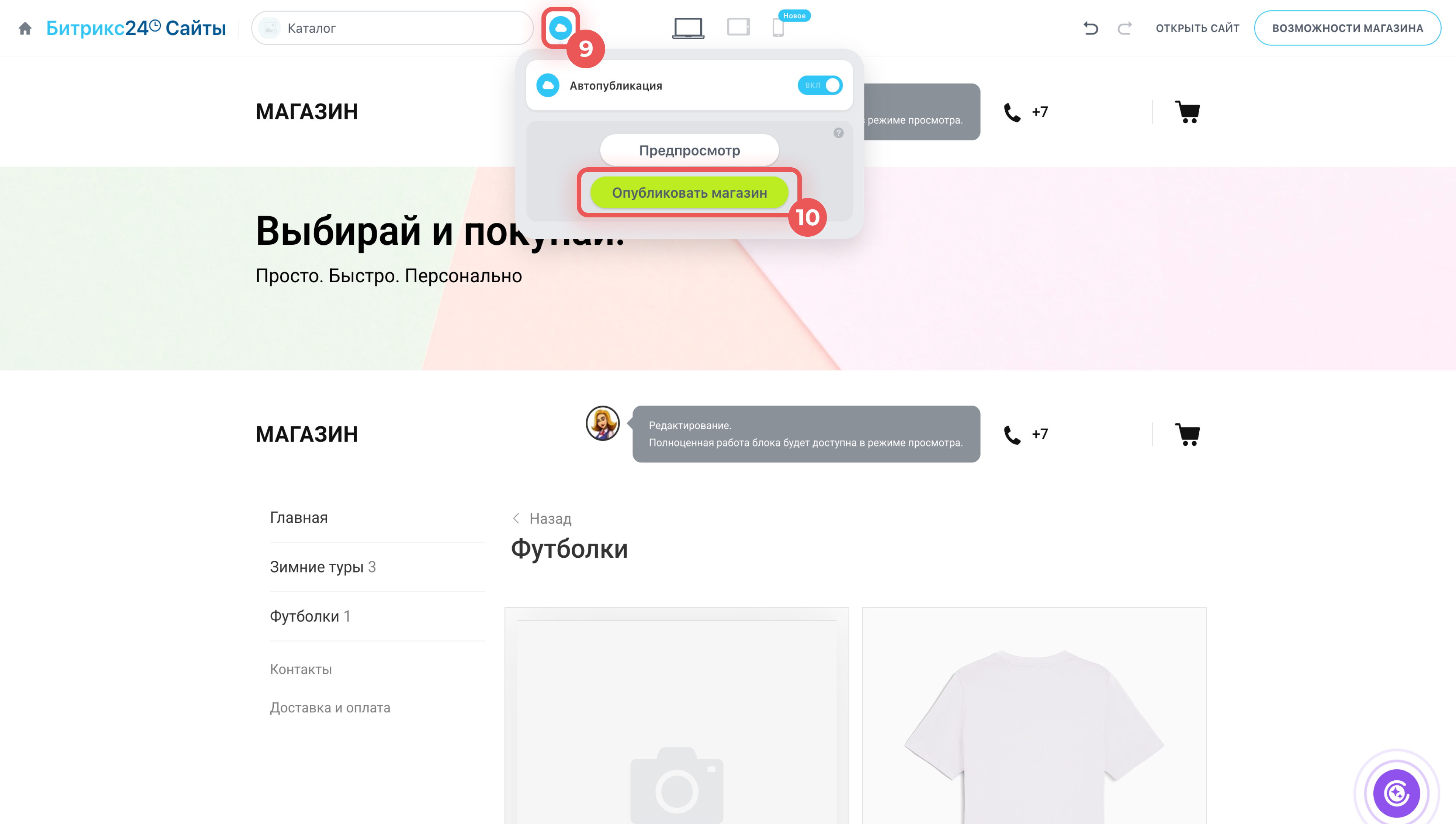 9–10. Нажмите на иконку облака > Опубликовать магазин.
