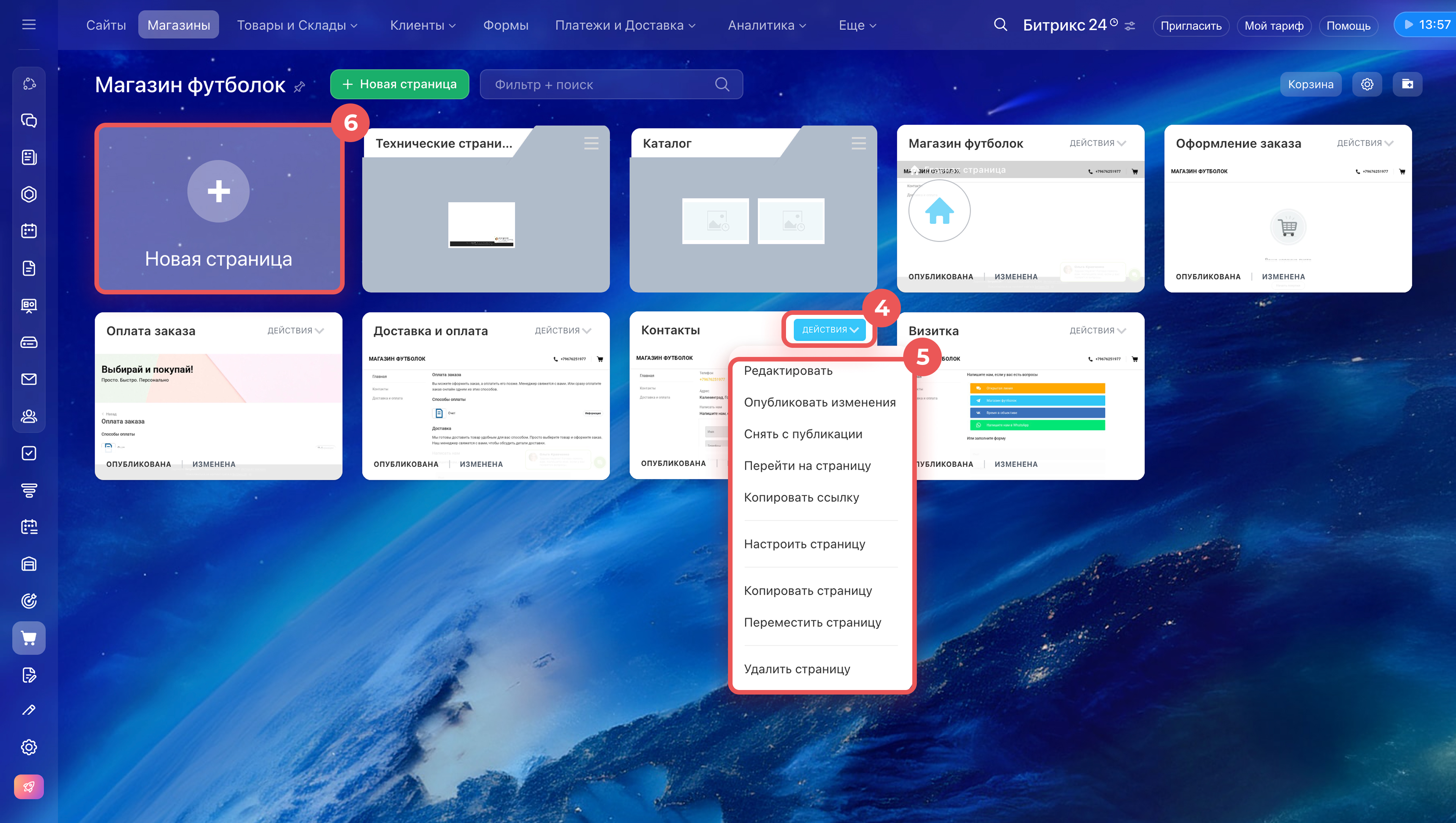 1–3. Перейдите в раздел Сайты и Магазины > Магазины. Около нужного магазина нажмите Страницы — откроется список всех страниц магазина.
