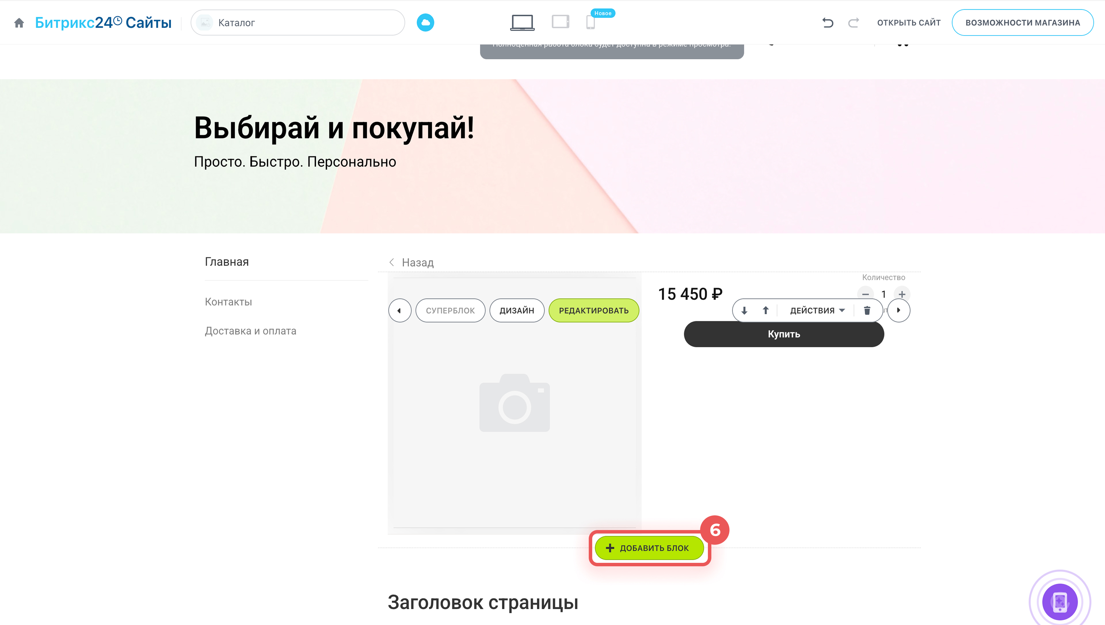 Страница — это отдельный раздел сайта магазина, например каталог, карточка товара, оформление заказа и другие разделы сайта. Страницы можно редактировать — изменить дизайн, добавить или удалить блоки и так далее.