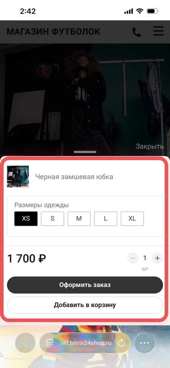 Так можно пройти весь путь клиента — от выбора товара до оформления заказа — и проверить, что магазин работает корректно. После оформления заказа придет СМС с подтверждением, а в CRM автоматически появится сделка с данными клиента и товарами.