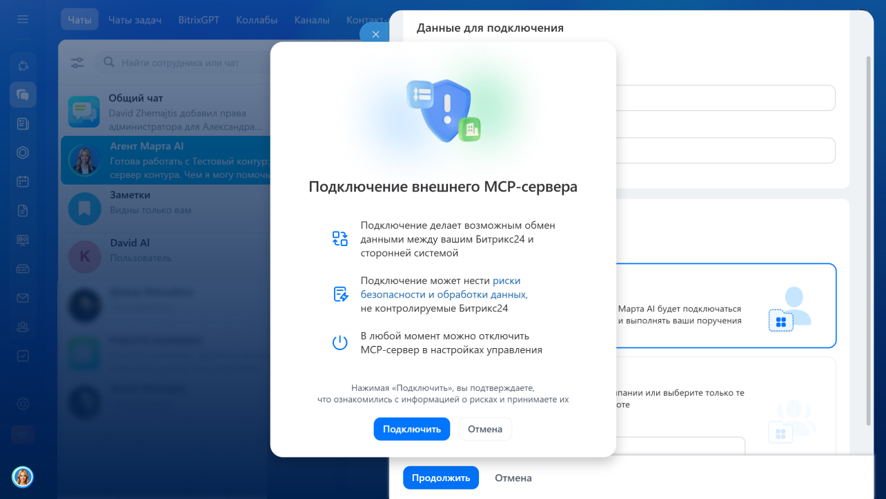 С помощью MCP Hub можно подключить к Битрикс24 внешние сервисы и работать с ними прямо в чате с Агентом Марта AI или другими AI-агентами. После подключения сотрудник может получать данные из сервисов и выполнять действия одним запросом в чат. Например, можно подключить Контур.Фокус и попросить Марту AI проверить компанию или найти реквизиты контрагента.