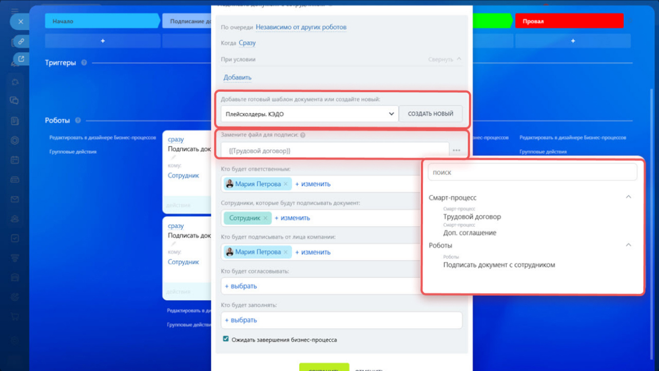 - Обновили сценарий для автоматизации HR-процессов в КЭДО — в роботе Подписать документ с сотрудником теперь можно не только выбрать готовый шаблон или создать новый, но и заменить файл для подписи.