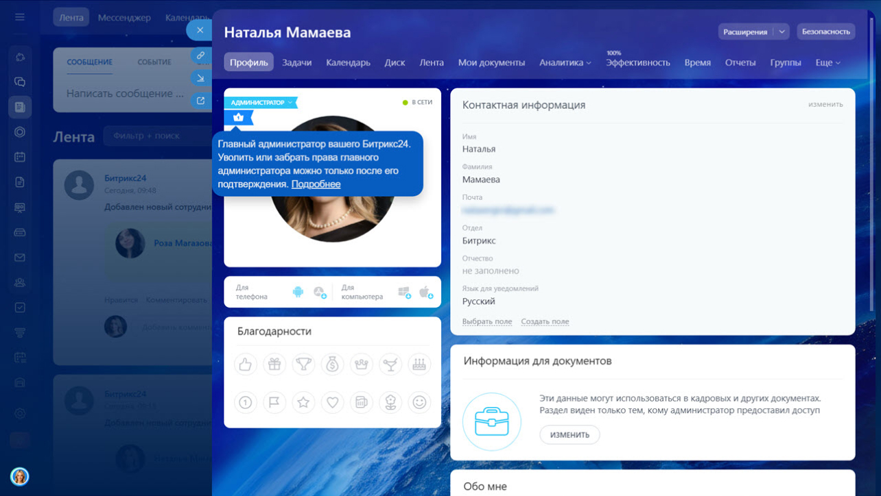 Главный администратор — это сотрудник, который создал ваш Битрикс24. На его e-mail приходят системные уведомления: продление тарифа, новости, приглашения на вебинары.