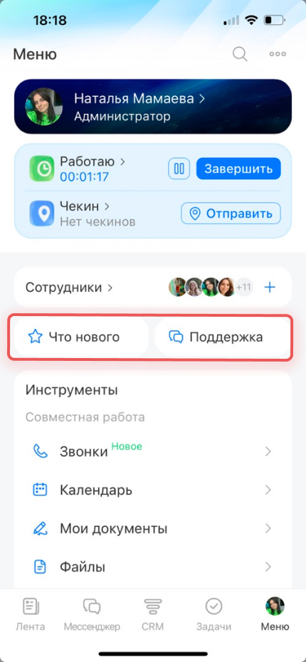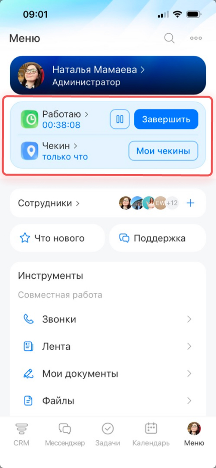 Учет рабочего времени помогает фиксировать начало и окончание рабочего дня прямо в приложении.