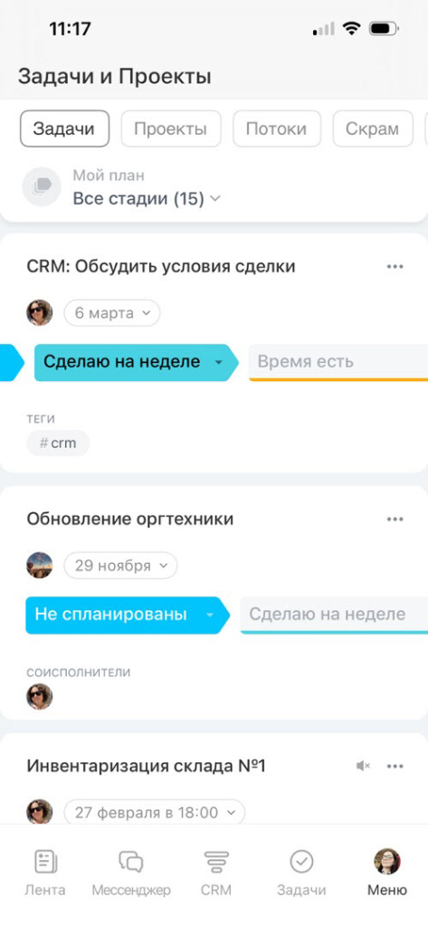 В разделе можно ставить задачи, объединять их в проекты и работать в потоках. Здесь удобно распределять работу, следить за сроками и обсуждать детали прямо в задачах.