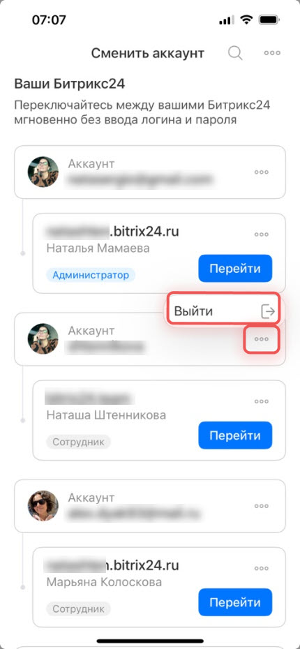 Выйти. При следующем запуске мобильного приложения Битрикс24 потребуется повторная авторизация.