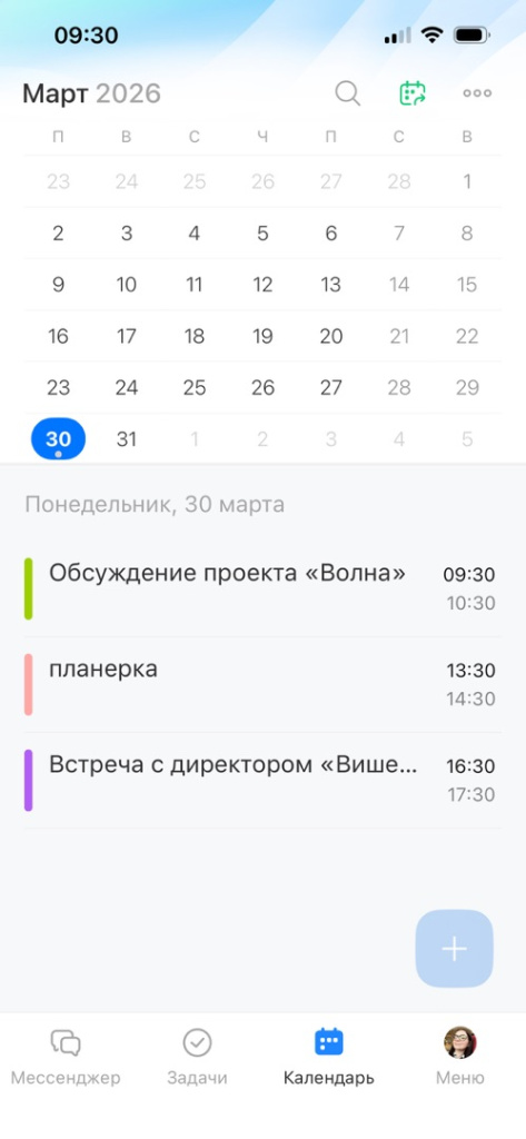 Календарь позволяет планировать личные события и встречи с коллегами. Можно создавать события, приглашать участников и предлагать свободные слоты.