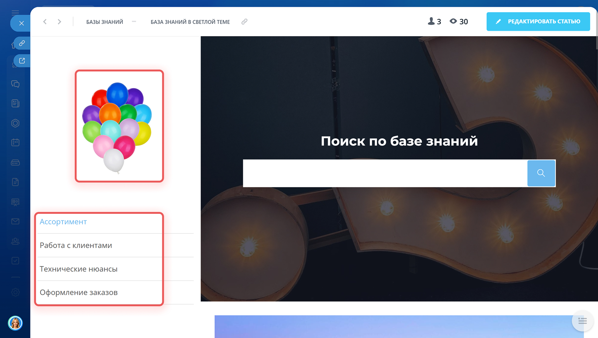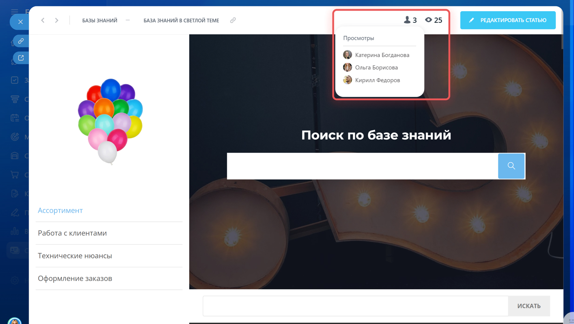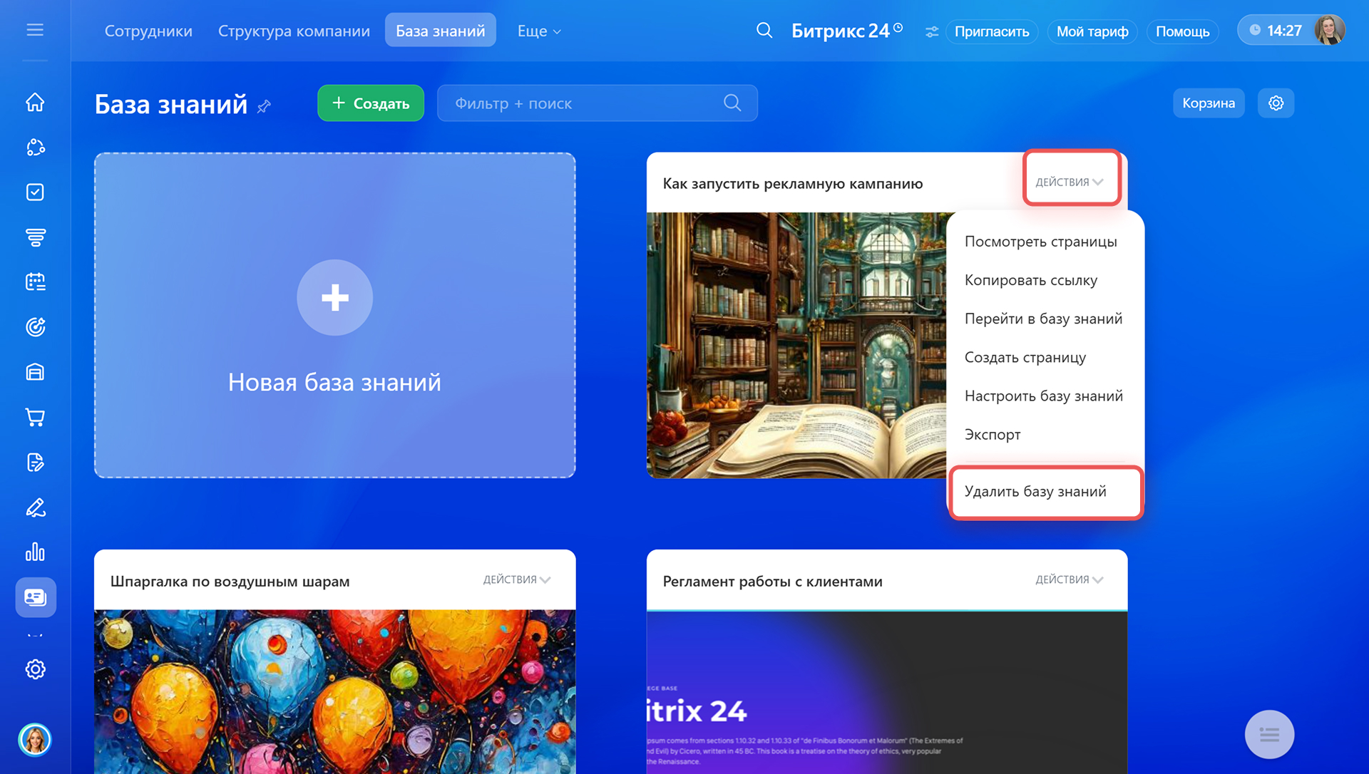 - Базы знаний можно оформлять под свои задачи, оценивать по просмотрам, копировать и удалять.