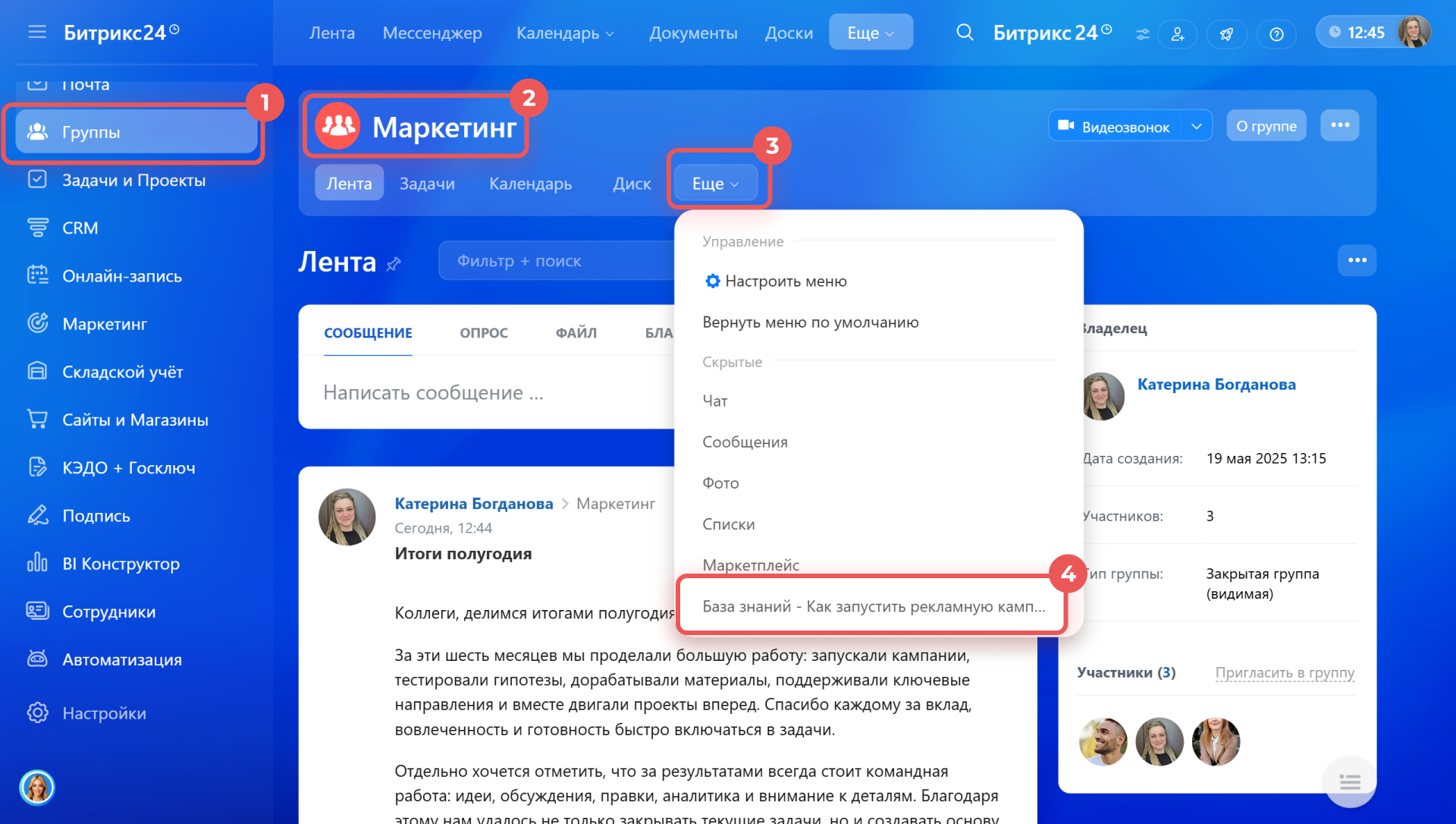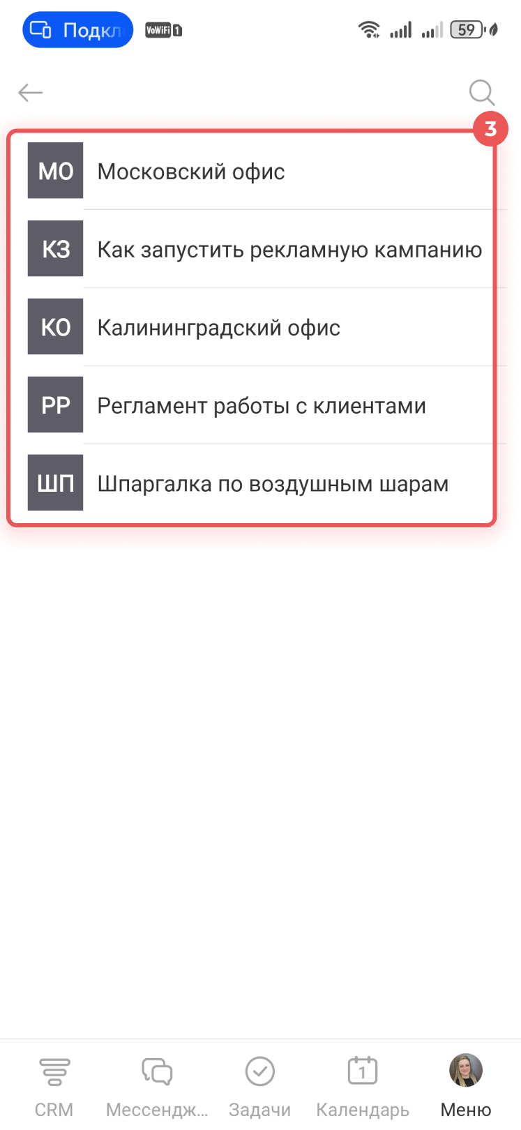 Онлайн-справочники можно добавить в разделы, группы и проекты, чтобы сотрудники открывали материалы там, где они нужны для работы. Например, в разделе CRM удобно прикрепить регламент работы с клиентами, а в группе — инструкцию по передаче задач между отделами.