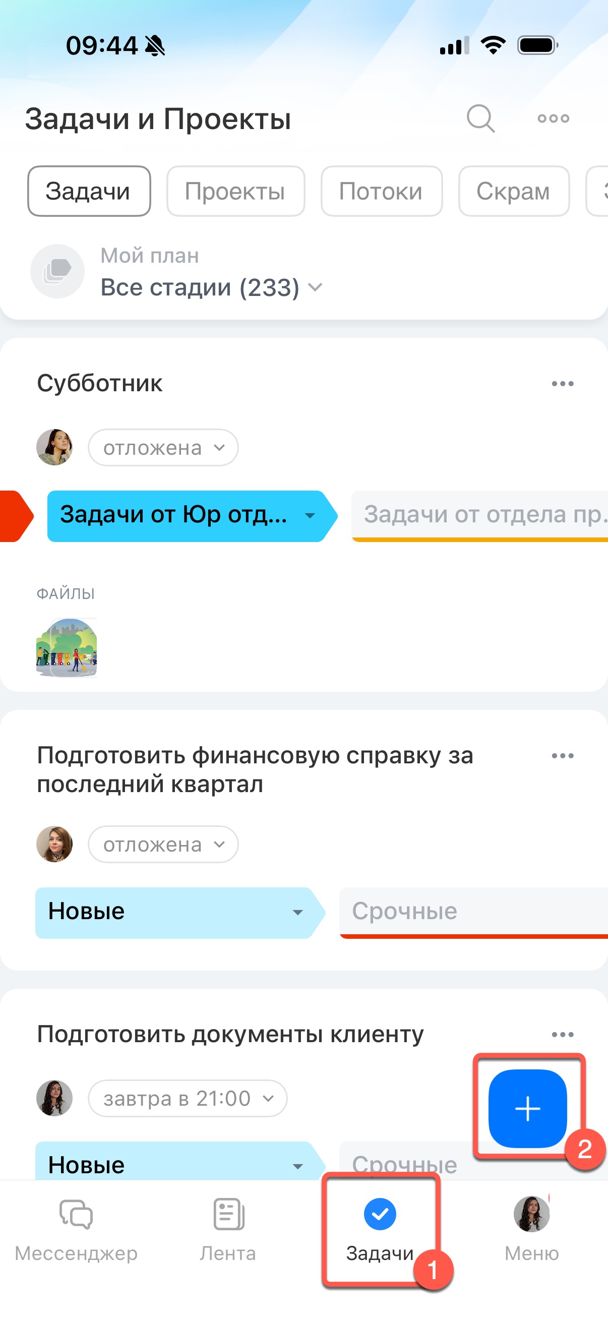 В нижнем меню приложения перейдите в раздел Задачи и нажмите Создать.