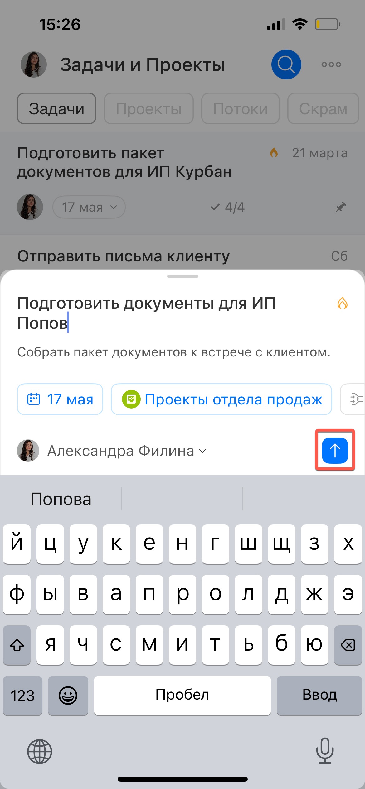 Укажите название, крайний срок и другие параметры. Нажмите Отправить (↑).