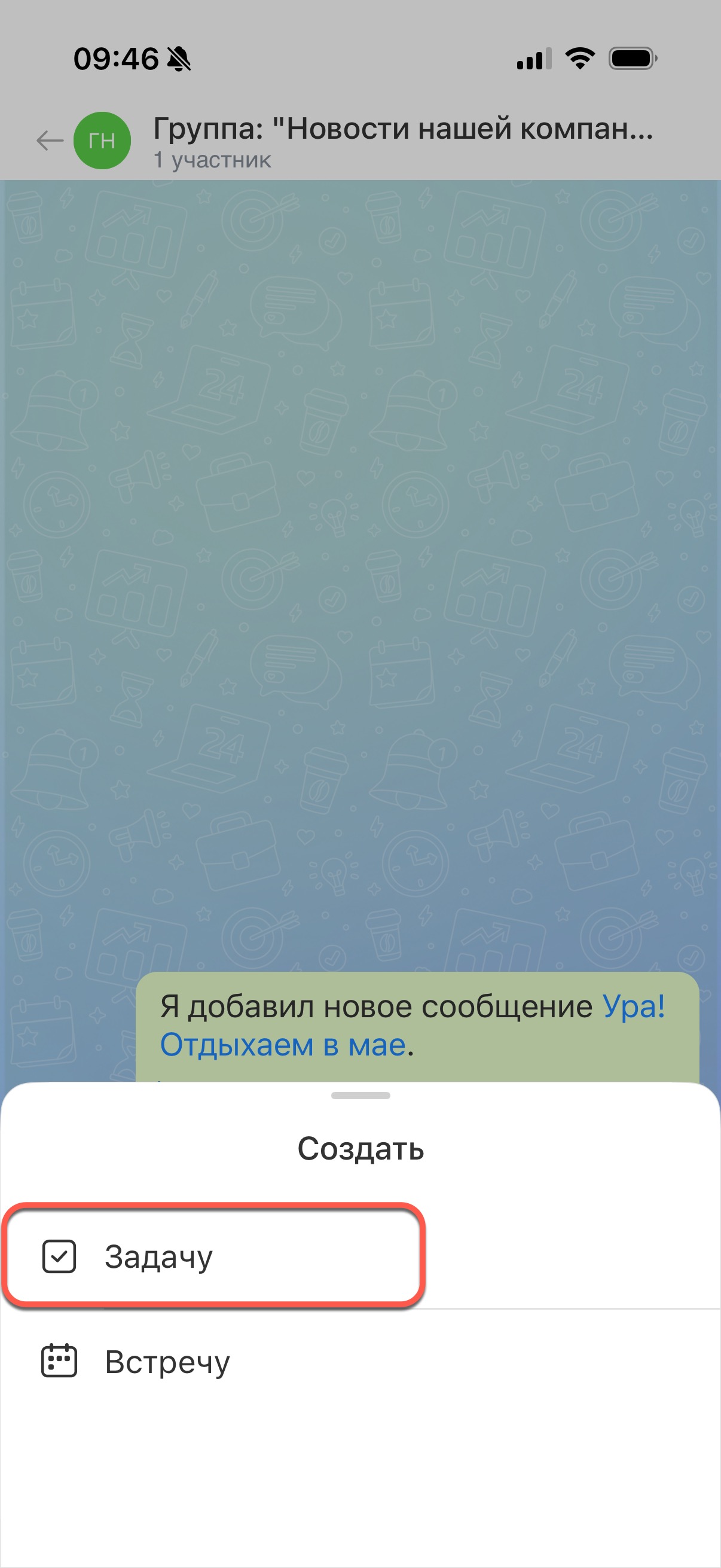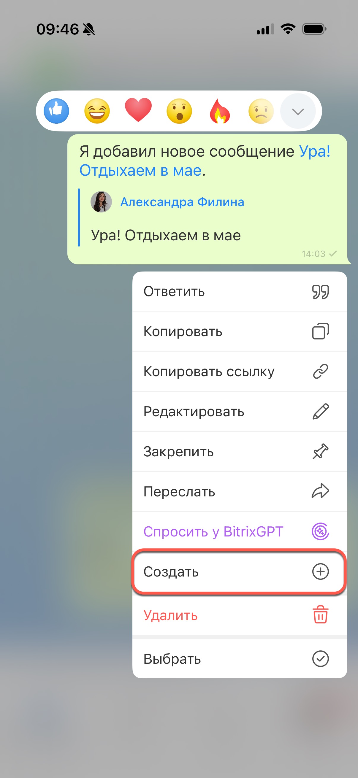 Откройте в мессенджере нужный чат и найдите сообщение, из которого нужно создать задачу. Зажмите сообщение и нажмите Создать.