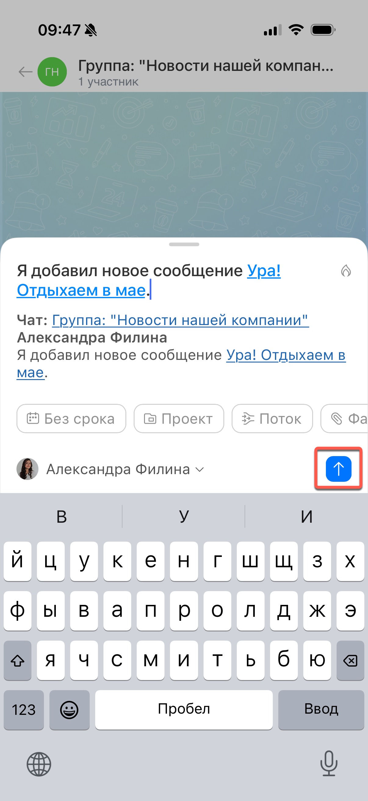 Текст сообщения автоматически подставится в название задачи — его можно изменить. По умолчанию вы становитесь постановщиком и исполнителем задачи. В личном чате собеседник добавится как наблюдатель, а в групповом — все участники чата. Заполните нужные поля и нажмите Отправить (↑).