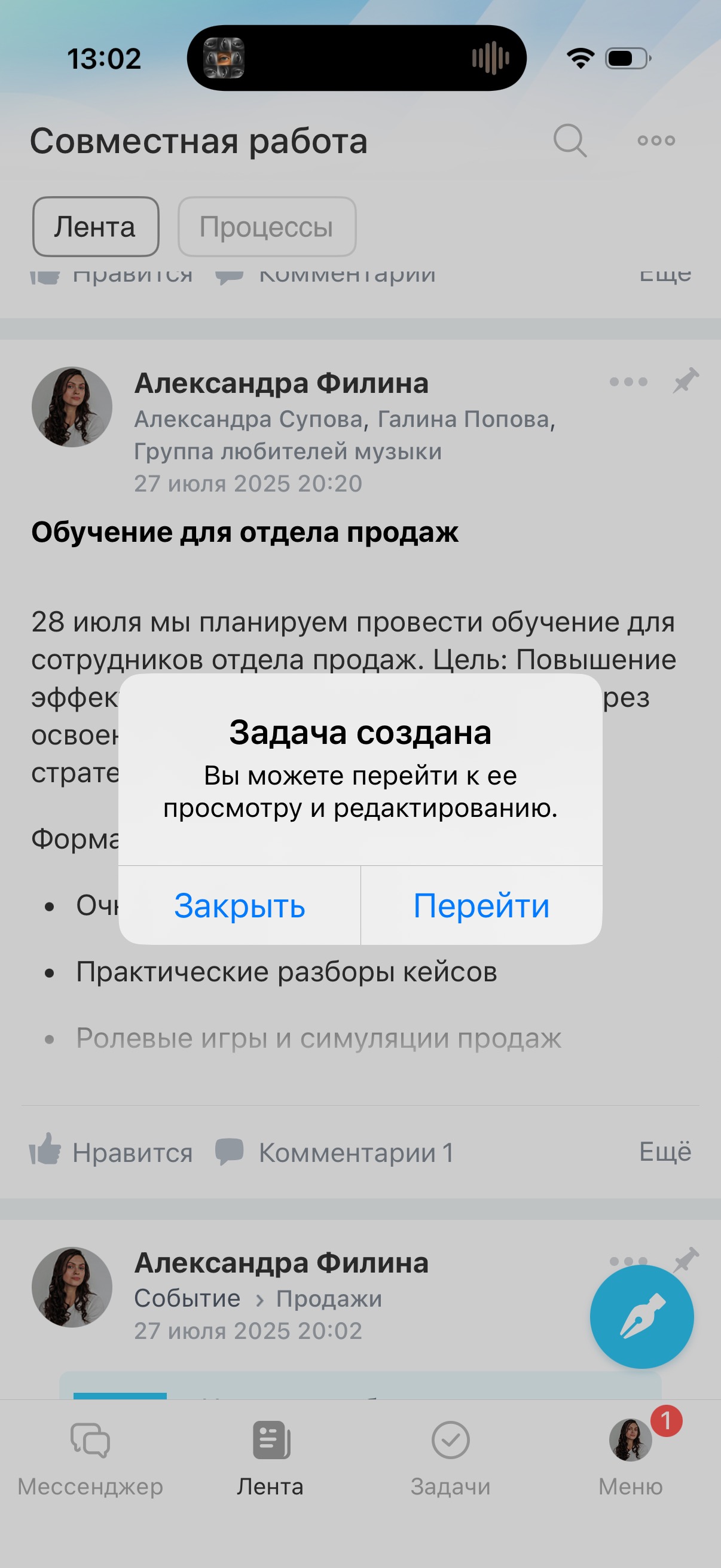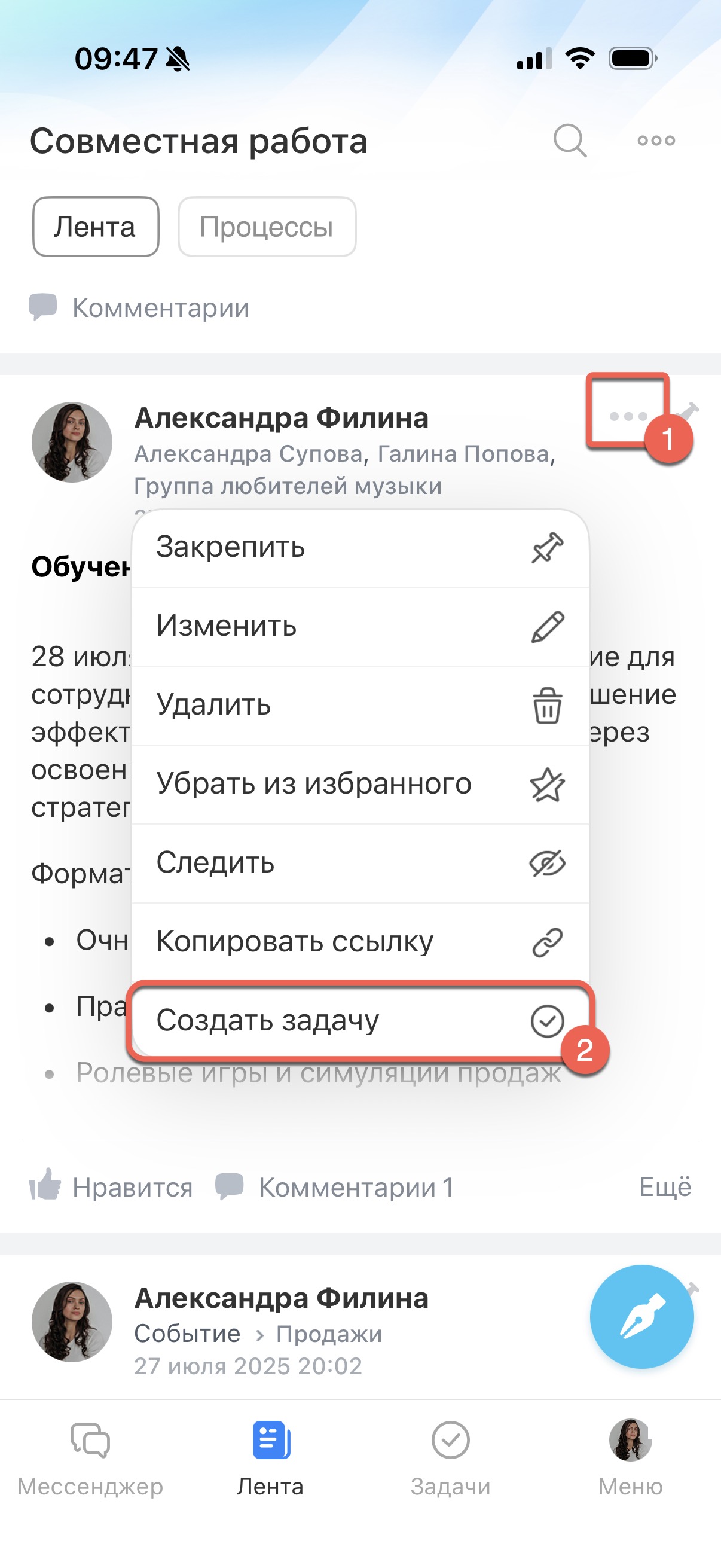 Как создать задачу из поста в ленте