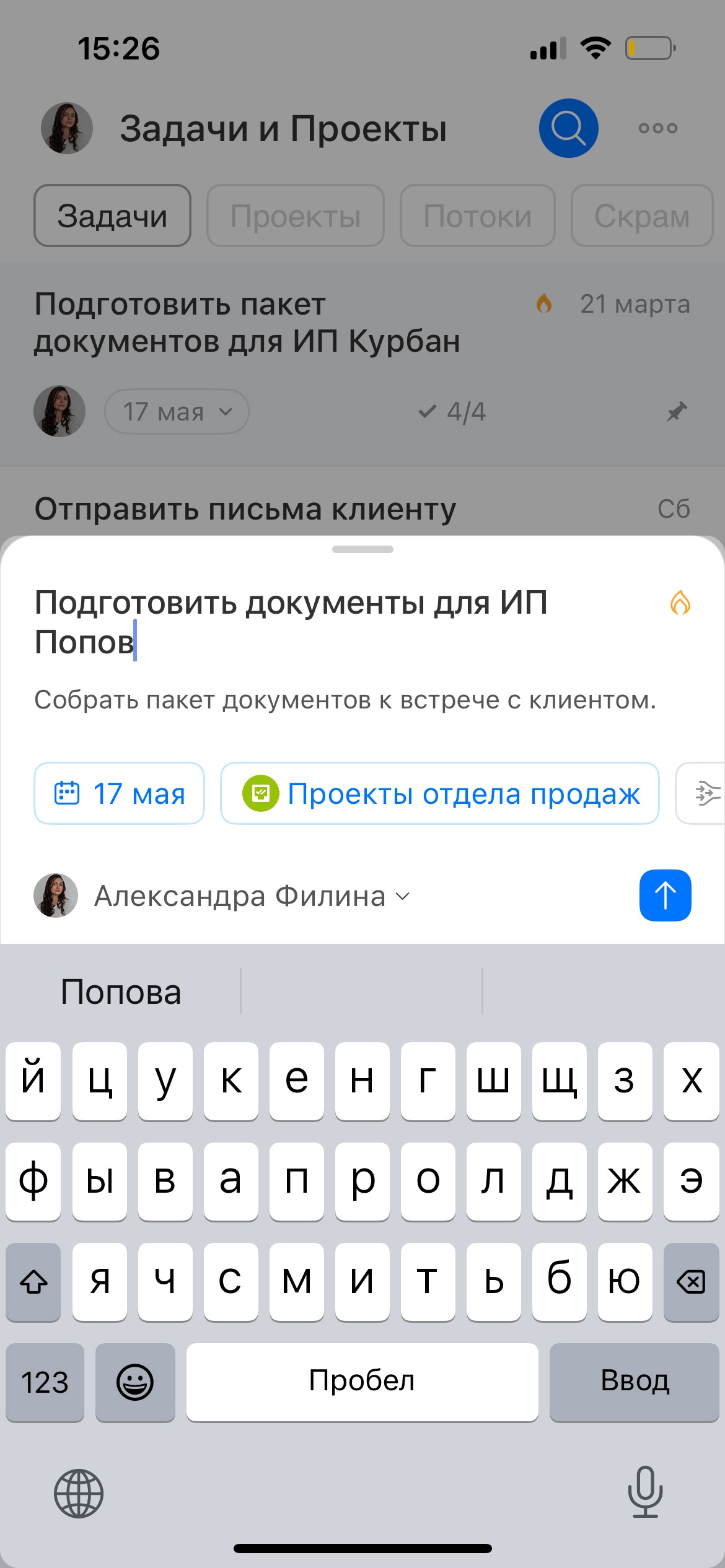 Чтобы задача была понятной и ее выполнили вовремя, важно сразу указать, что нужно сделать и какой результат ожидается. При создании задачи в мобильном приложении можно: