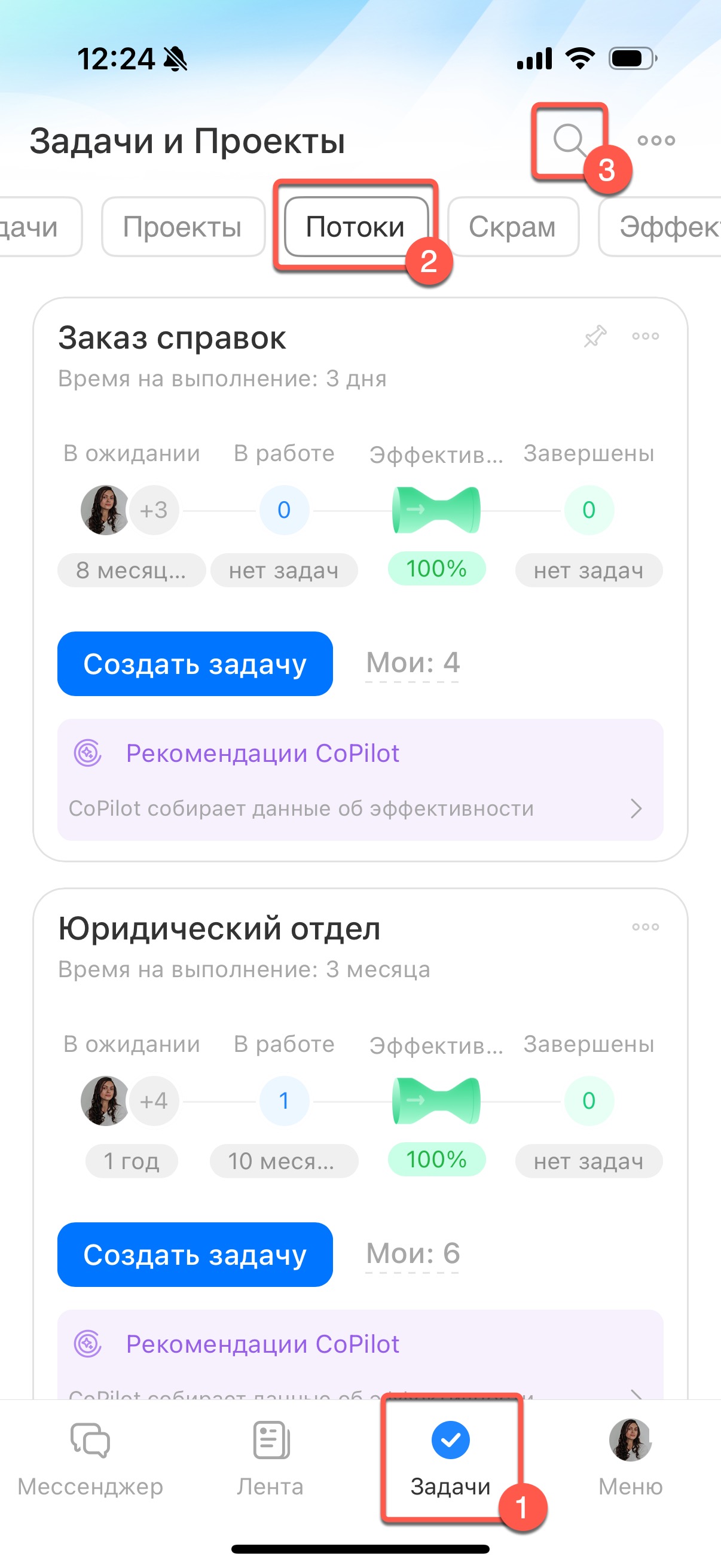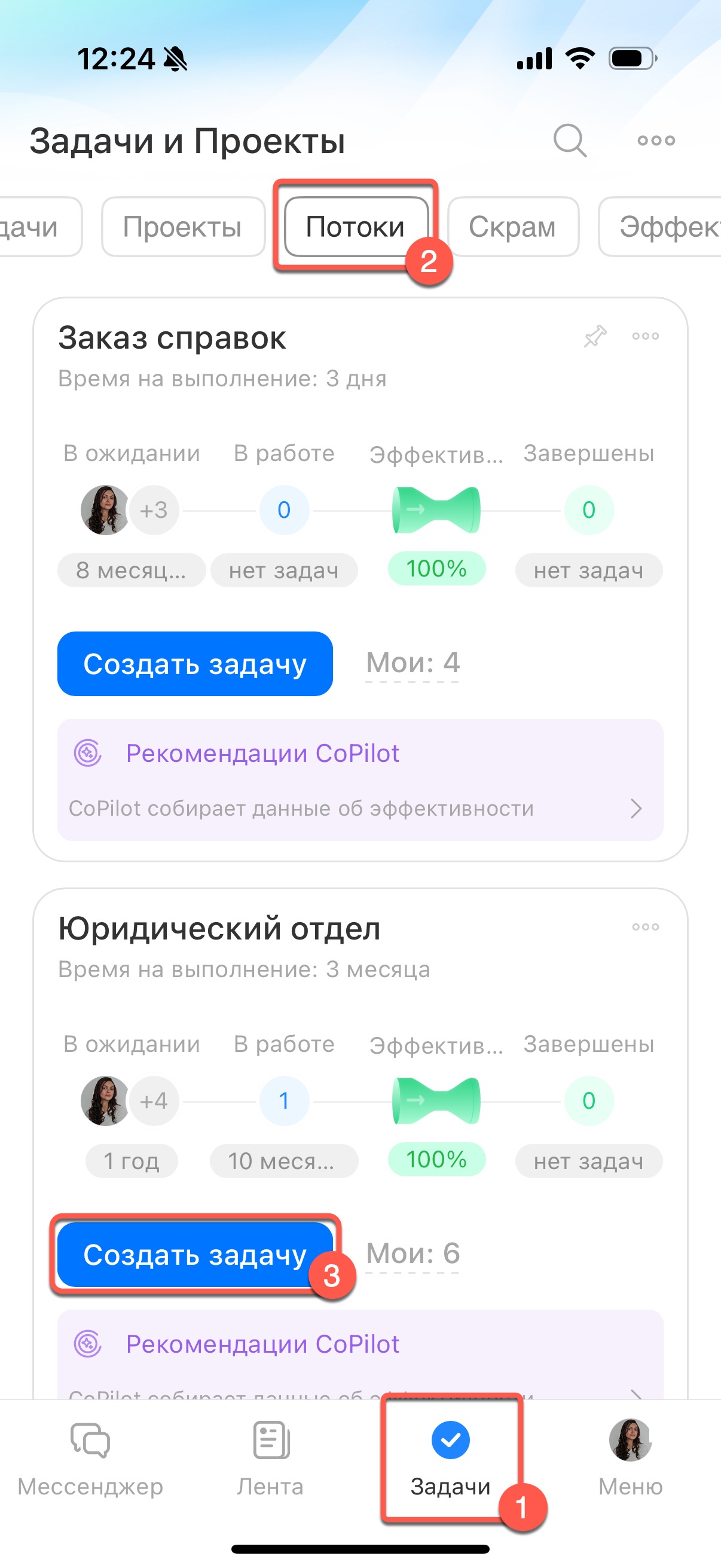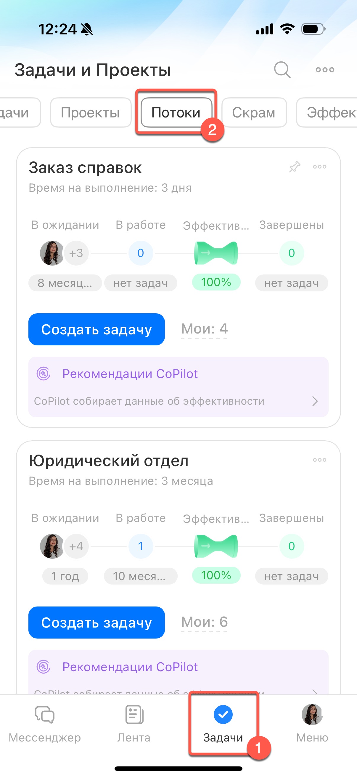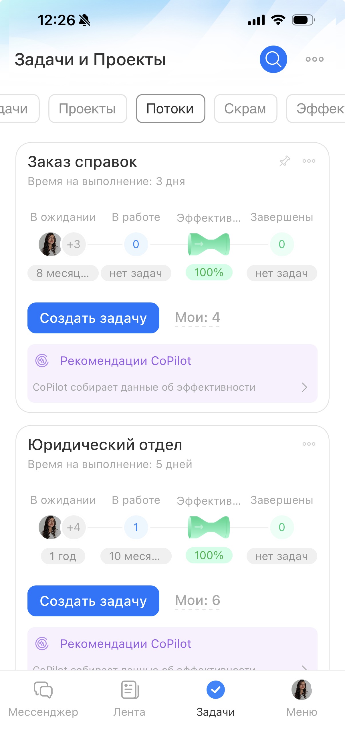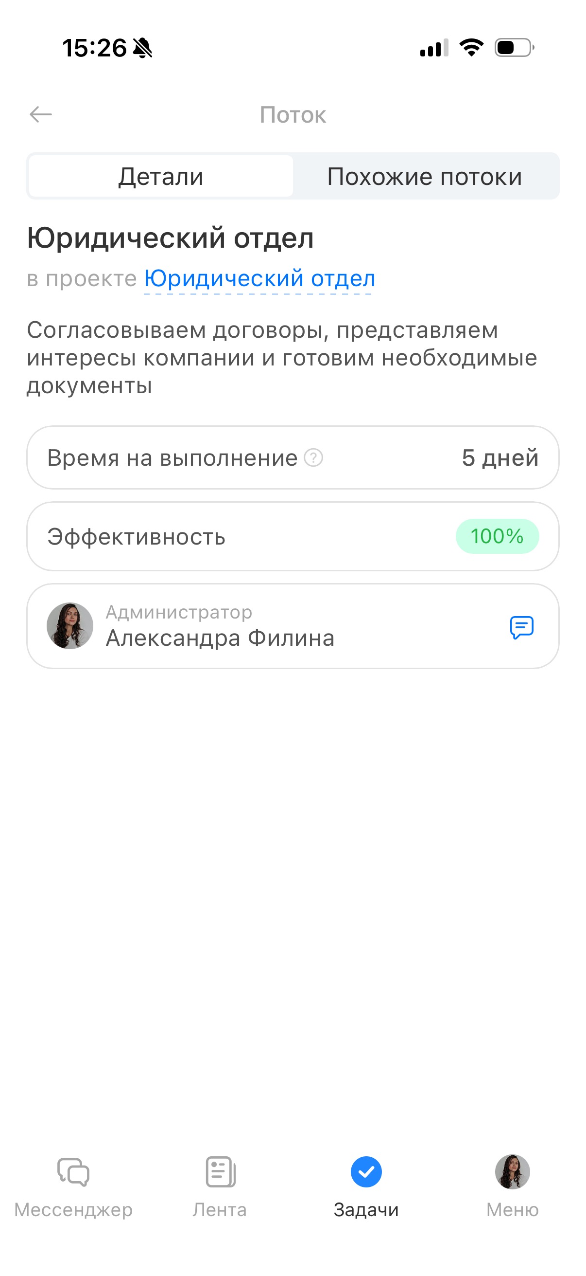 Потоки помогают ставить задачи команде, даже если сотрудник не знает, кому именно их назначить. Например, задачу можно отправить в поток юридического отдела — она попадет в работу по правилам, которые настроены в потоке.