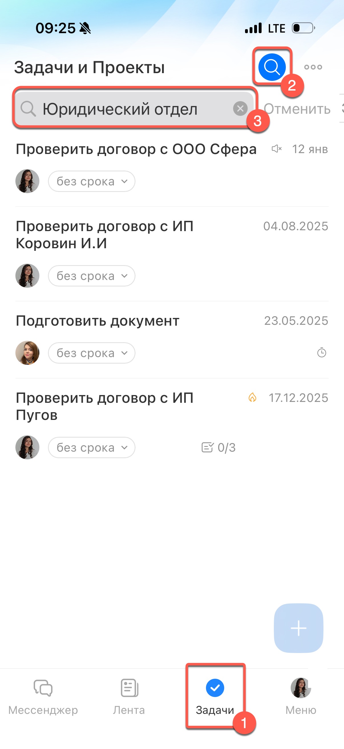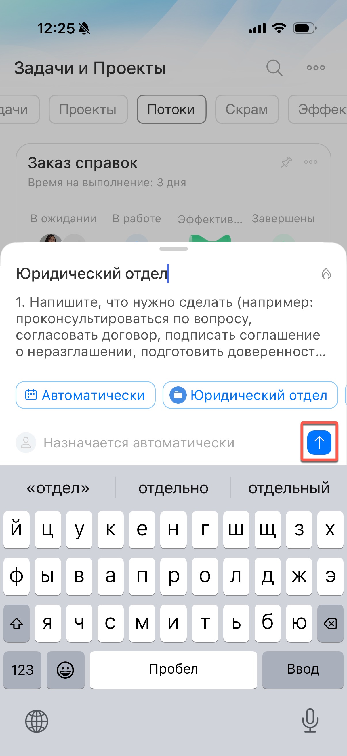 Введите название и описание задачи, добавьте файлы, учет времени и другое. Исполнитель, срок и проект подставятся автоматически. Нажмите Отправить (↑). Задача появится в общем списке поручений.