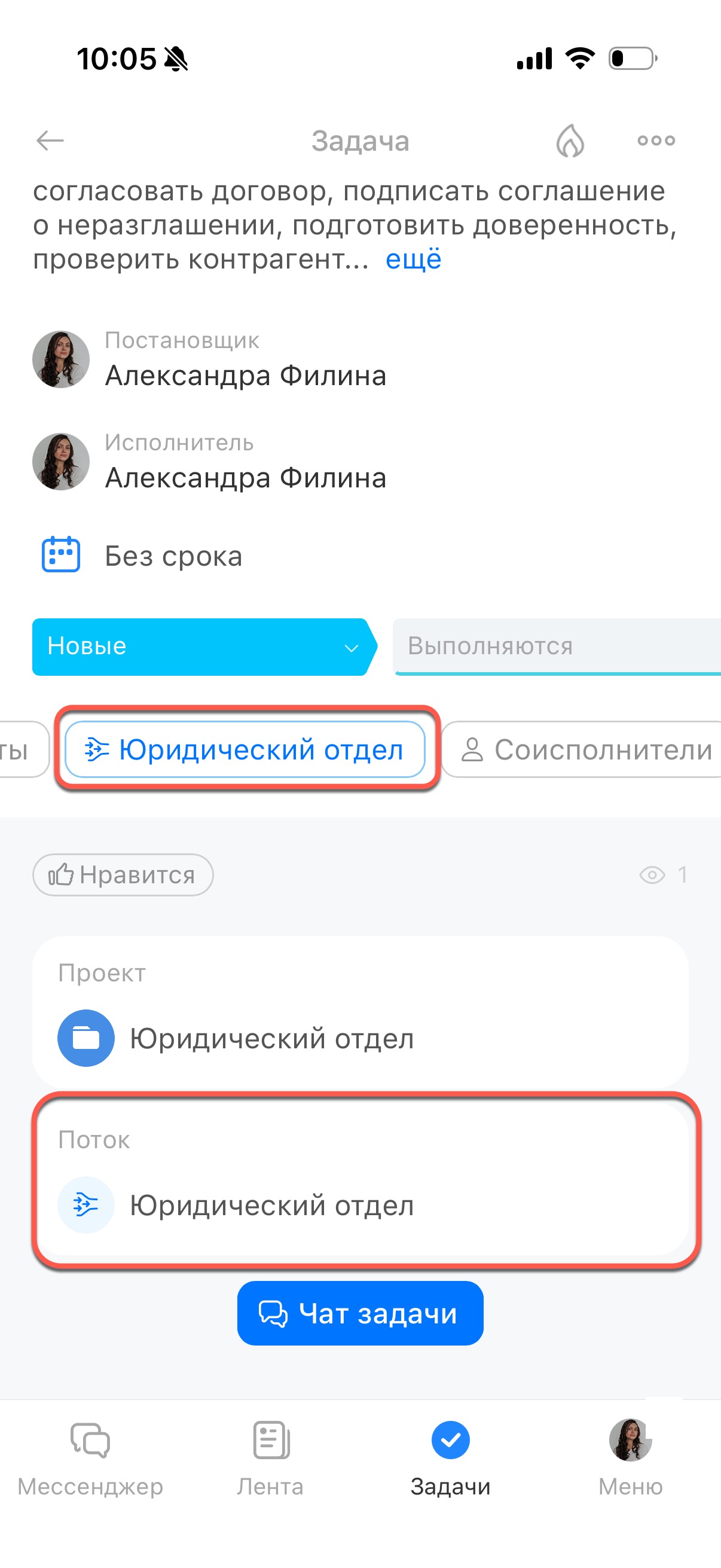 Чтобы проверить, что задача привязана к нужному потоку, откройте ее — в разделе Потоки будет указан соответствующий поток.