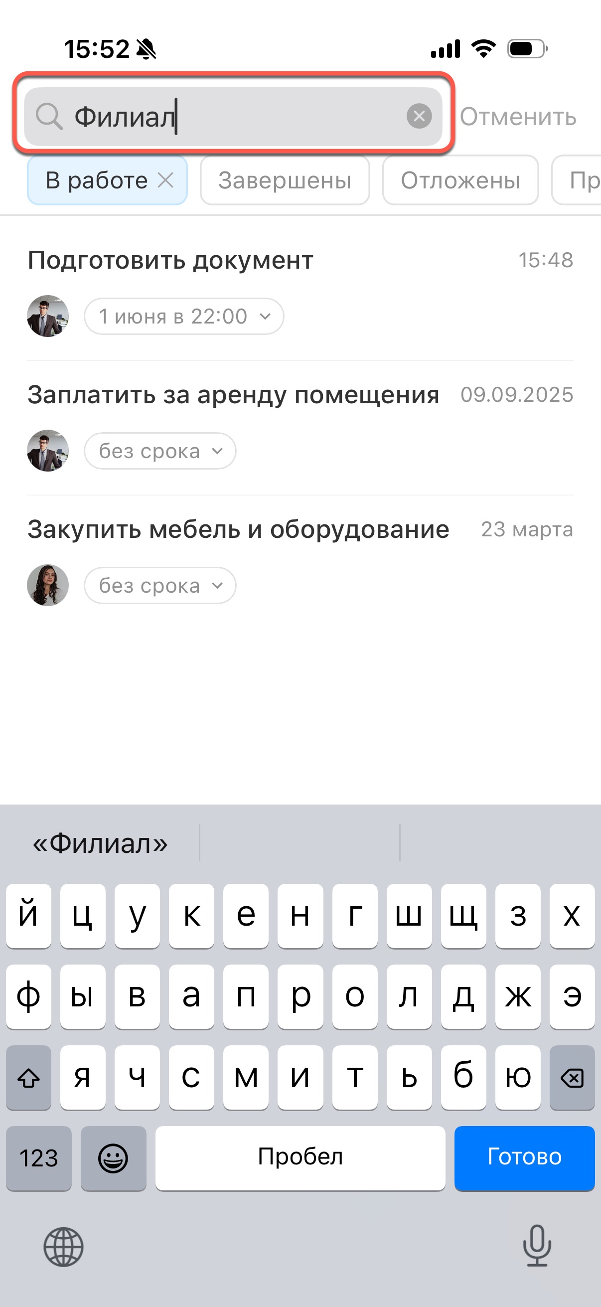 В строке введите название скрама или задачи из него. Допустим, в компании есть скрам «Открываем новый филиал». В результатах отобразятся все задачи из этого скрама и другие, в названии которых есть это слово.