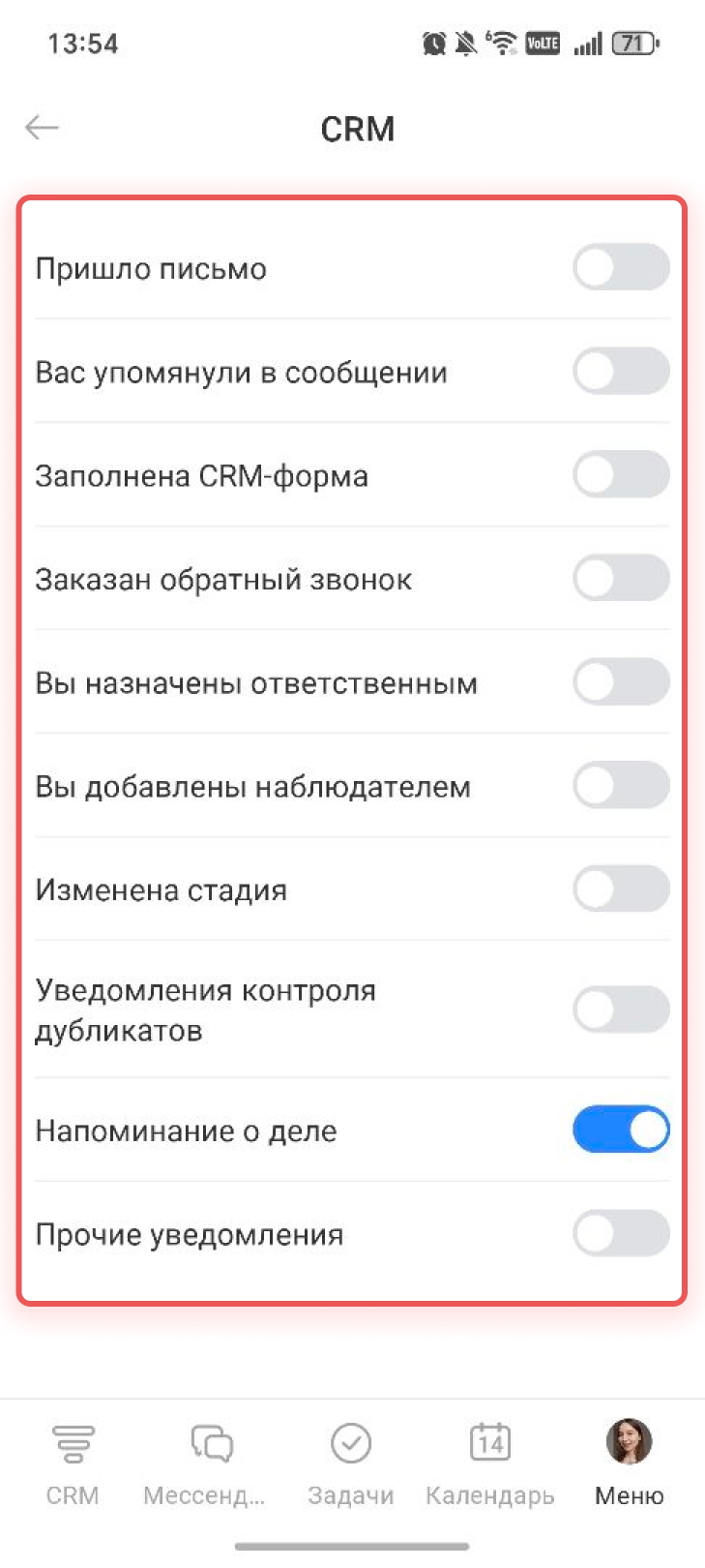 Причина. В мобильном приложении Битрикс24 уведомления настраиваются отдельно для разных событий. Например, в CRM можно включить уведомления о новых письмах, упоминаниях, заполнении CRM-формы и других событиях. По умолчанию включены только напоминания о делах, поэтому другие уведомления могут не приходить.